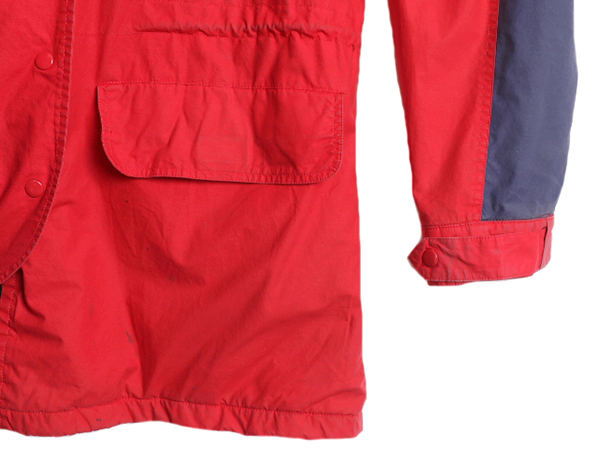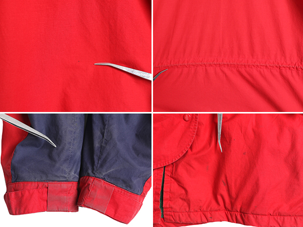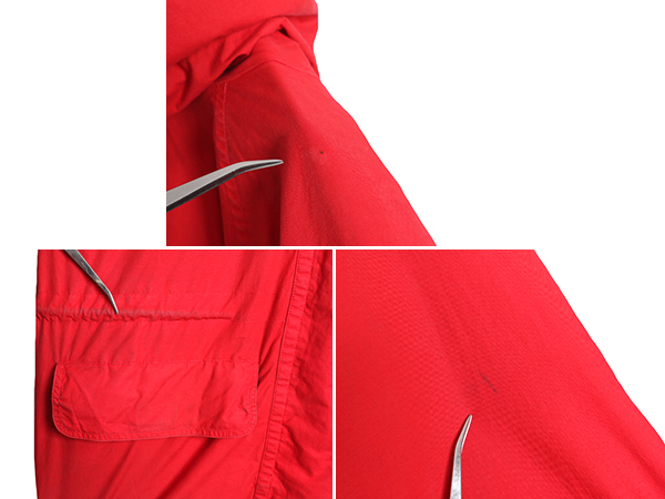 フロント中央裾、右袖中央、両袖先、バック中央上部に色移り。 フロント・バックウエストのドローコード上に薄ヨゴレがあります。 いずれも古着慣れしている方なら まったく気にならない程度です。(写真参照) それ以外は、多少の使用感がある程度で 特に表記する所のない非常に良い状態です。 |