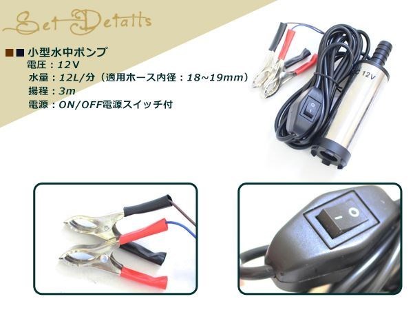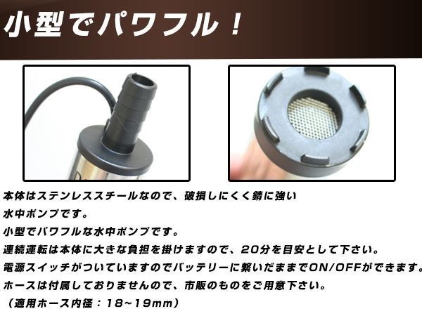 12V 小型 軽量 水中ポンプ 12L/min ケーブル3m スイッチ式 バッテリー クランプ ON/OFFスイッチ付き スレンレス製 DC12V 1.5A 英文説明書付