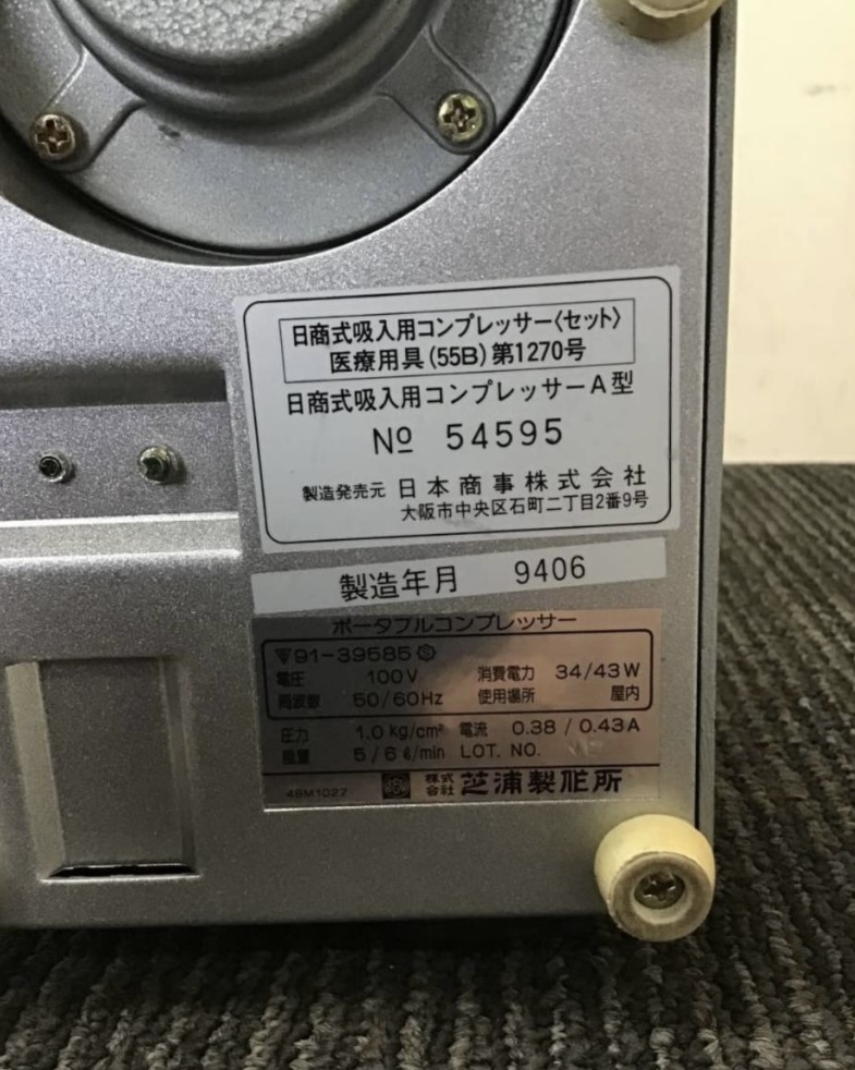 ★岐阜発 日商式吸入用コンプレッサーA型 / 芝浦製作所 / ポータブルコンプレッサー / 通電確認 / 中古品 10/10★