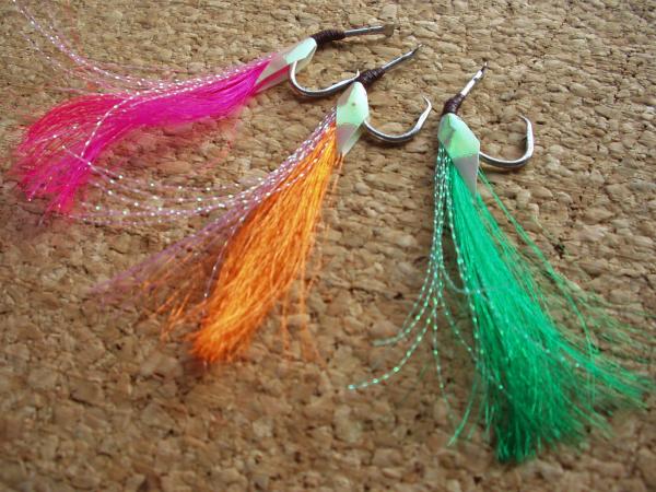 漁師さんご用達のムツ針20号に【オレンジ、ピンク、緑、各10本づつ、計30本】フラッシャ-、ハゲ皮オーロラ巻いてあります。ハリスは東レの漁業者用テグス(12号、14号、16号)から100cm以内でご指定下さい。 自作品になります、ご理解頂ける方宜しくお願い致します。送料【クロネコヤマトの非対面配達(ポスト投函)にて全国無料】は当方にて負担致します。