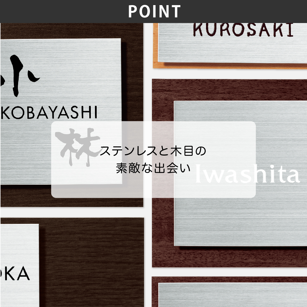 商品詳細 | ステンレスと木目の落ち着いたモダンな表札。別寸サイズでのサイズオーダーも可能です。 |