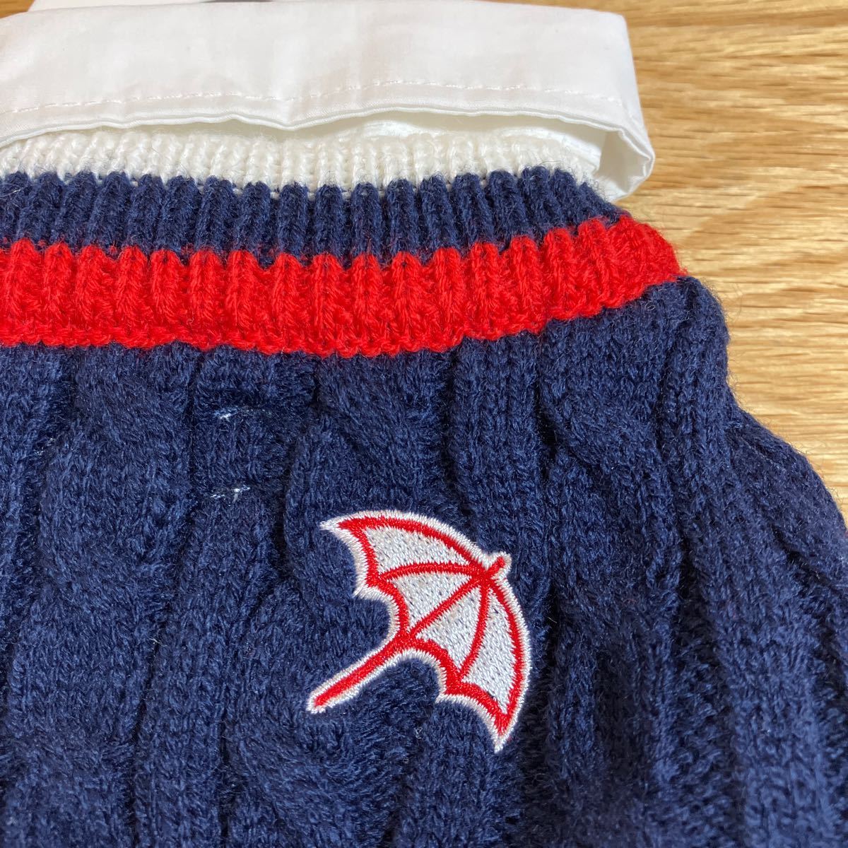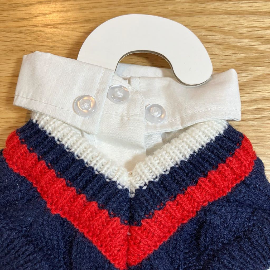 ホワイトシャツにネイビーのニットベストを重ね着したようなお洒落なデザインです。