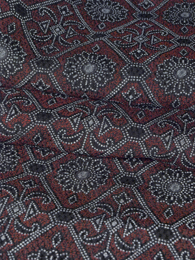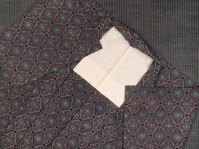 黒色の地に、たて縞の地紋が織り出され、深く沈んだ深緋(こきひ)色で霜降りと藍白(あいじろ)色で幾何学的にあらわされた草花の配された襷(たすき)の文様が染められている、紋羽二重の羽織です。袷仕立てです。 更紗調のオリエンタルな趣が粋に感じられます。シャリ感とハリのある平織地です。 ユーズド品と思われますが、使用感は感じられません。右胸裏の羽裏に直径約 1-2mm のよごれが 1、2 か所ありますが、そのほかに目につくしみやよごれ、褪色などのダメージはなく、きれいな状態です。 |