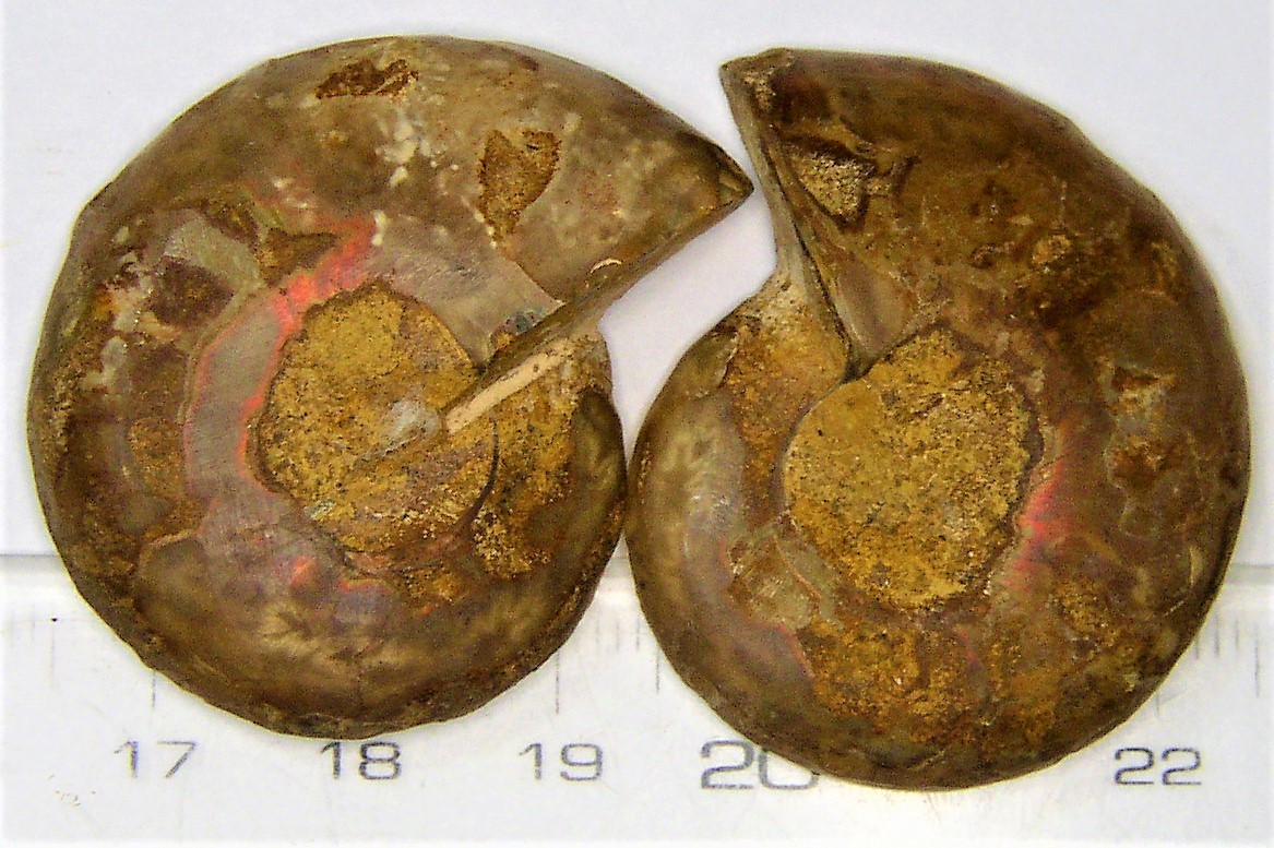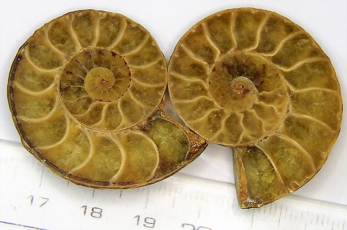 アンモナイト化石の全体が方解石に置換されています。半分に切断しアンモナイト特有の内部の隔壁が観察できます。