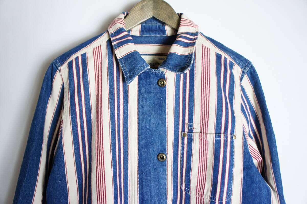 全体にストライプ柄デザインが施されたカバーオールジャケット。