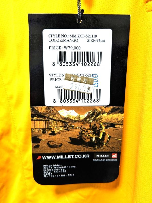 なので韓国向けのMillet製品としてタグや裏生地のラベルにハングル語でプリントされており、また、販売価格がW(韓国通貨ウォン)表記になっております。サイズも韓国市場向けのサイズ表記(cm)ですが、計測単位がcmなので日本人にとっても安心です。