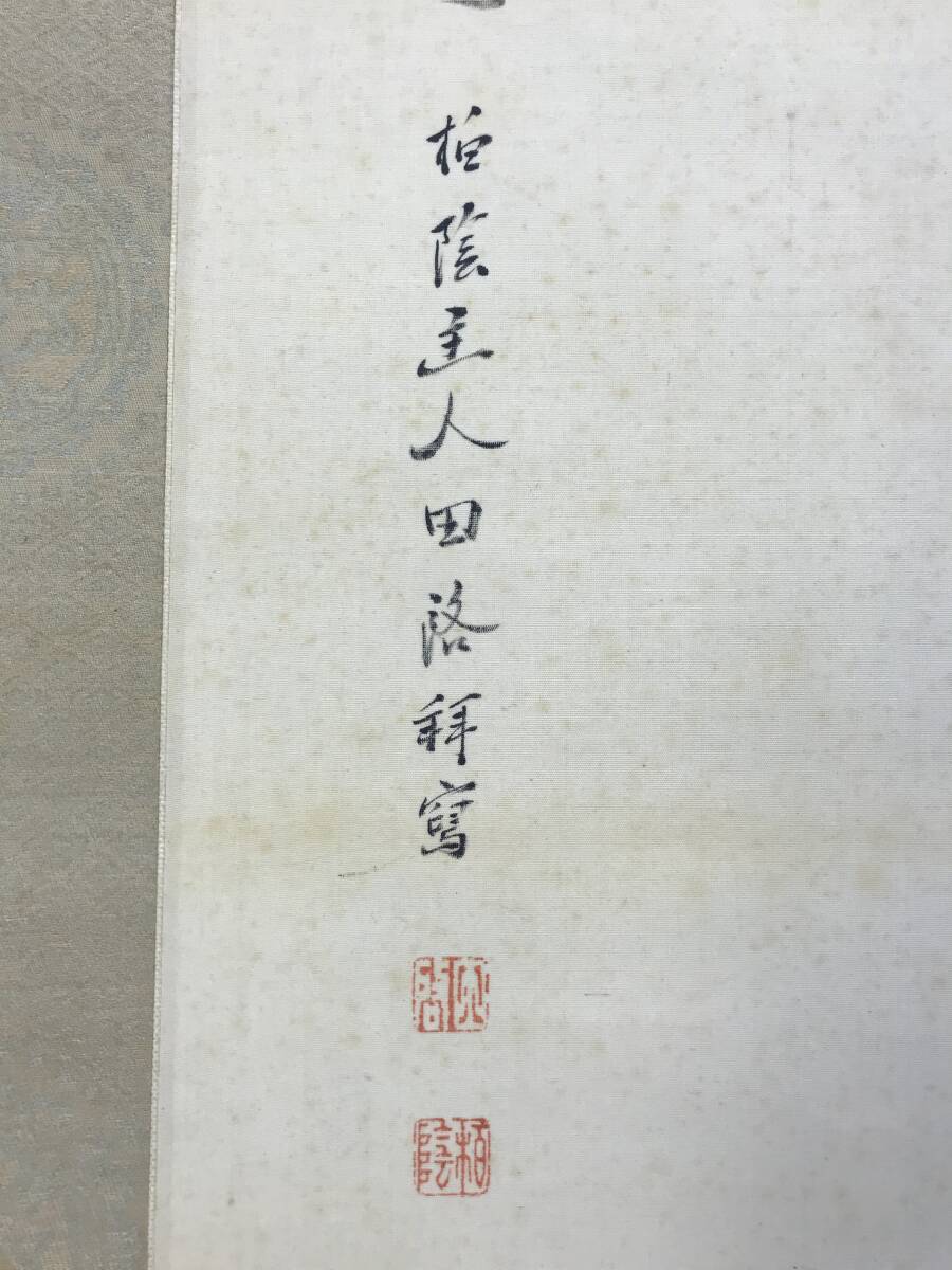 【作品状態】 本紙は絹本肉筆です。本紙は薄汚れ、全体に多数の糊シミあります。表装は絹表装で概ね良好です。軸先は牙です。