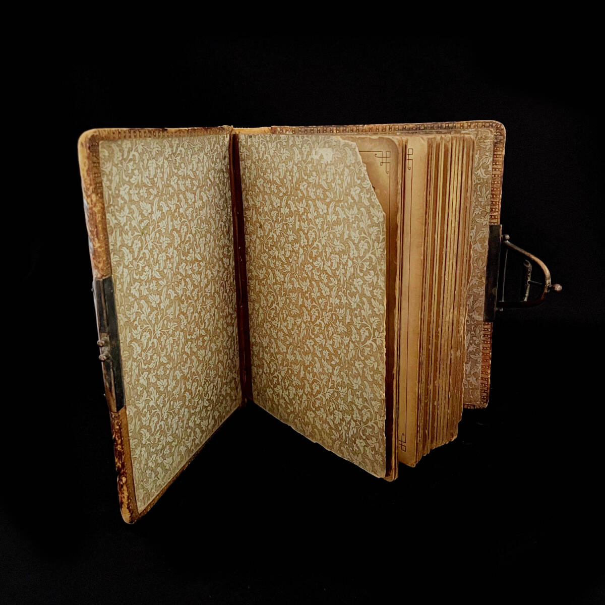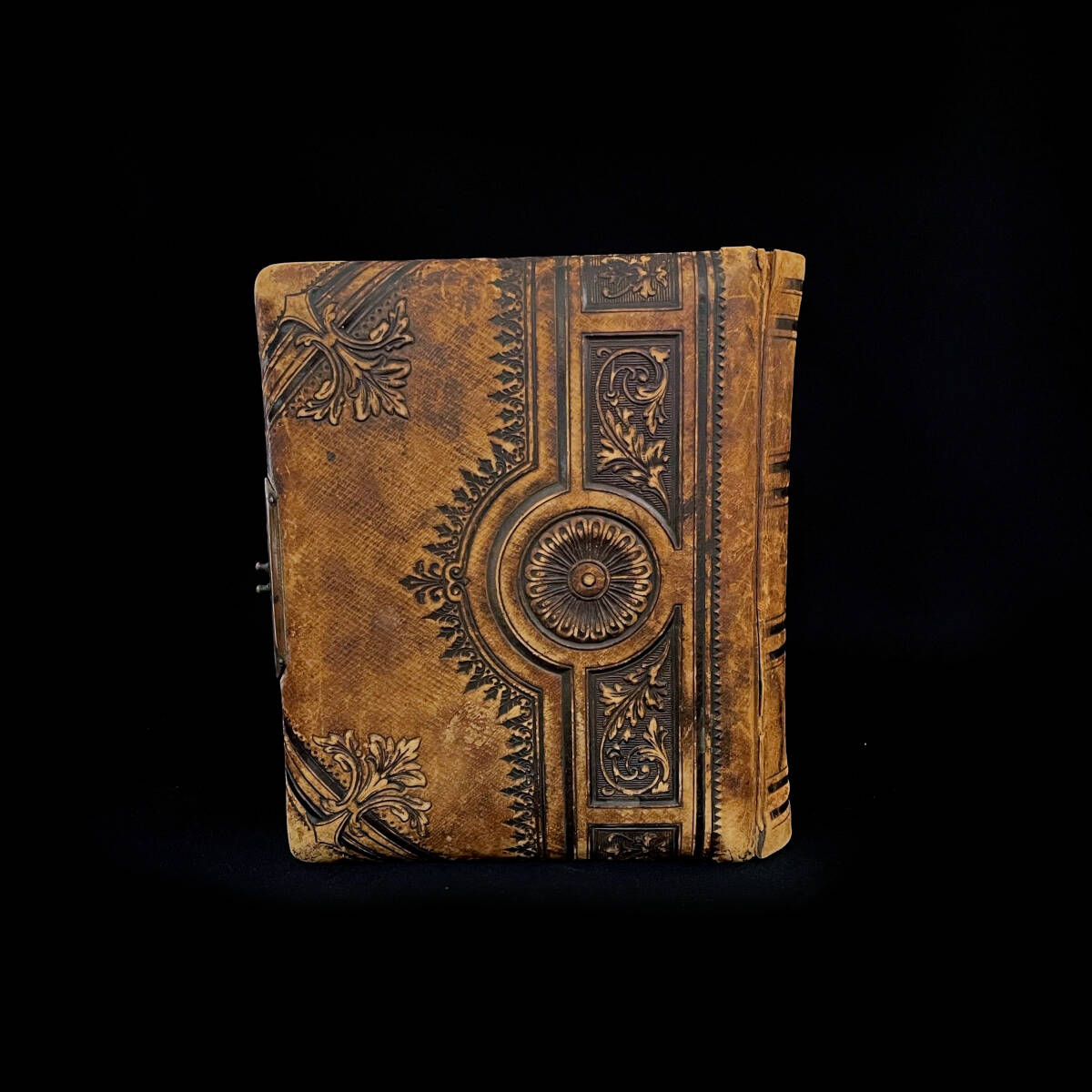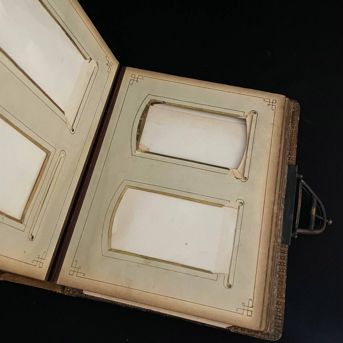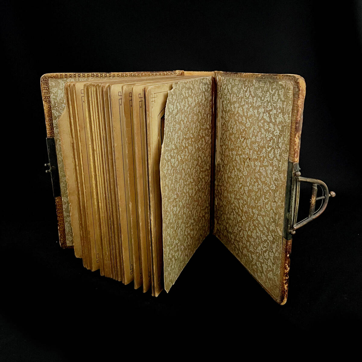年代物のため、レザーにスレや小傷等の傷みがあり、 台紙にも破れやシミ等ございます。 商品画像をよくご覧になり、 古い物にご理解頂ける方ご検討ください。 ●サイズ:高さ 21cm、幅18cm、奥行6.5cm (誤差はご了承ください) |