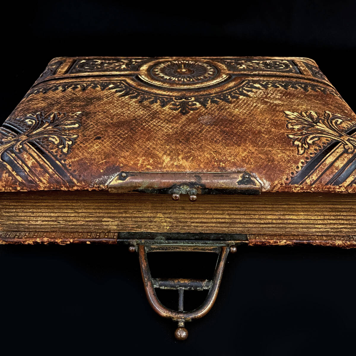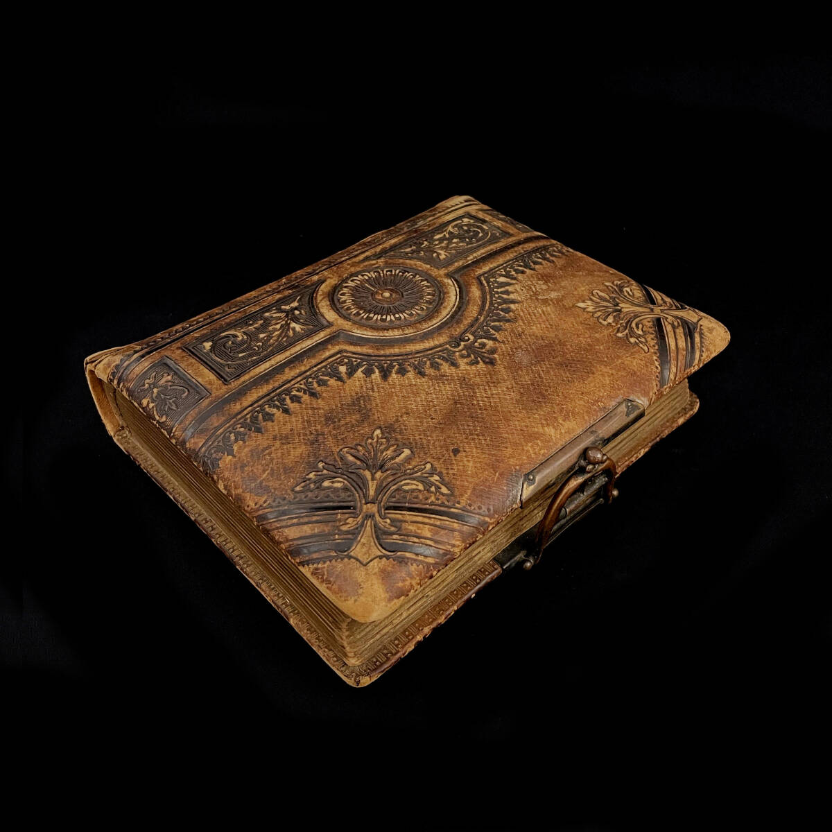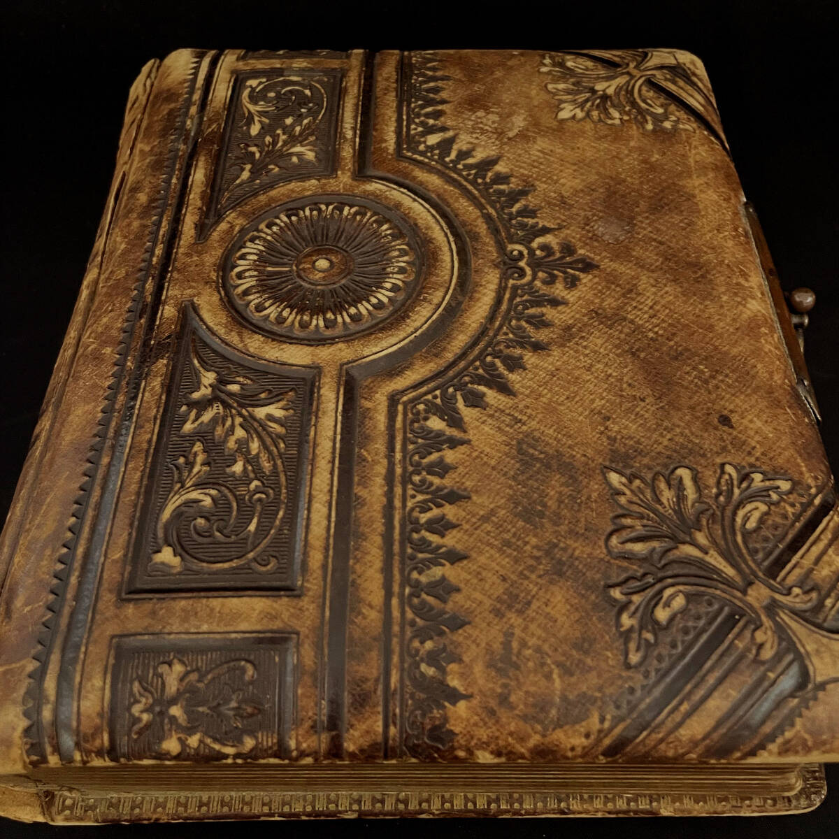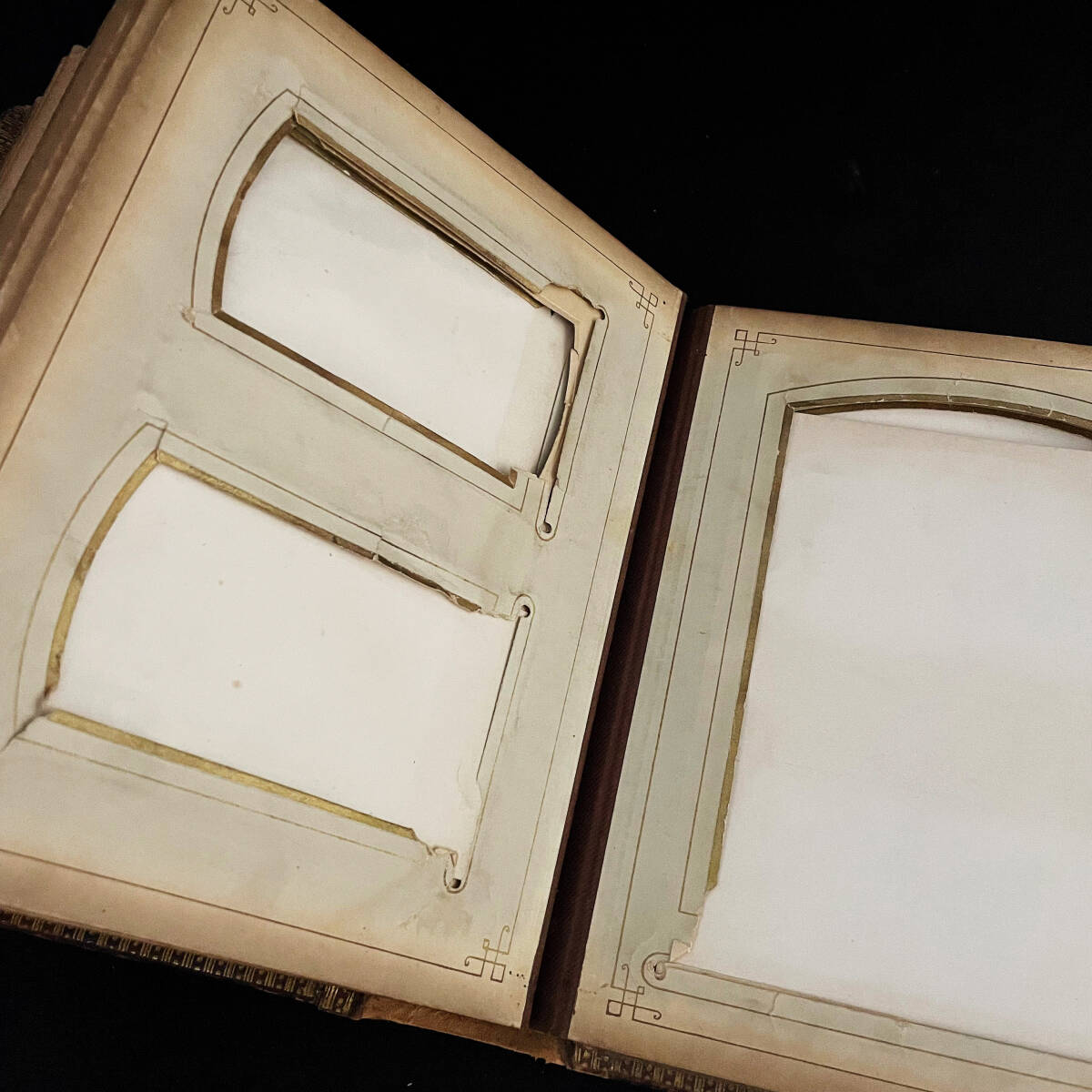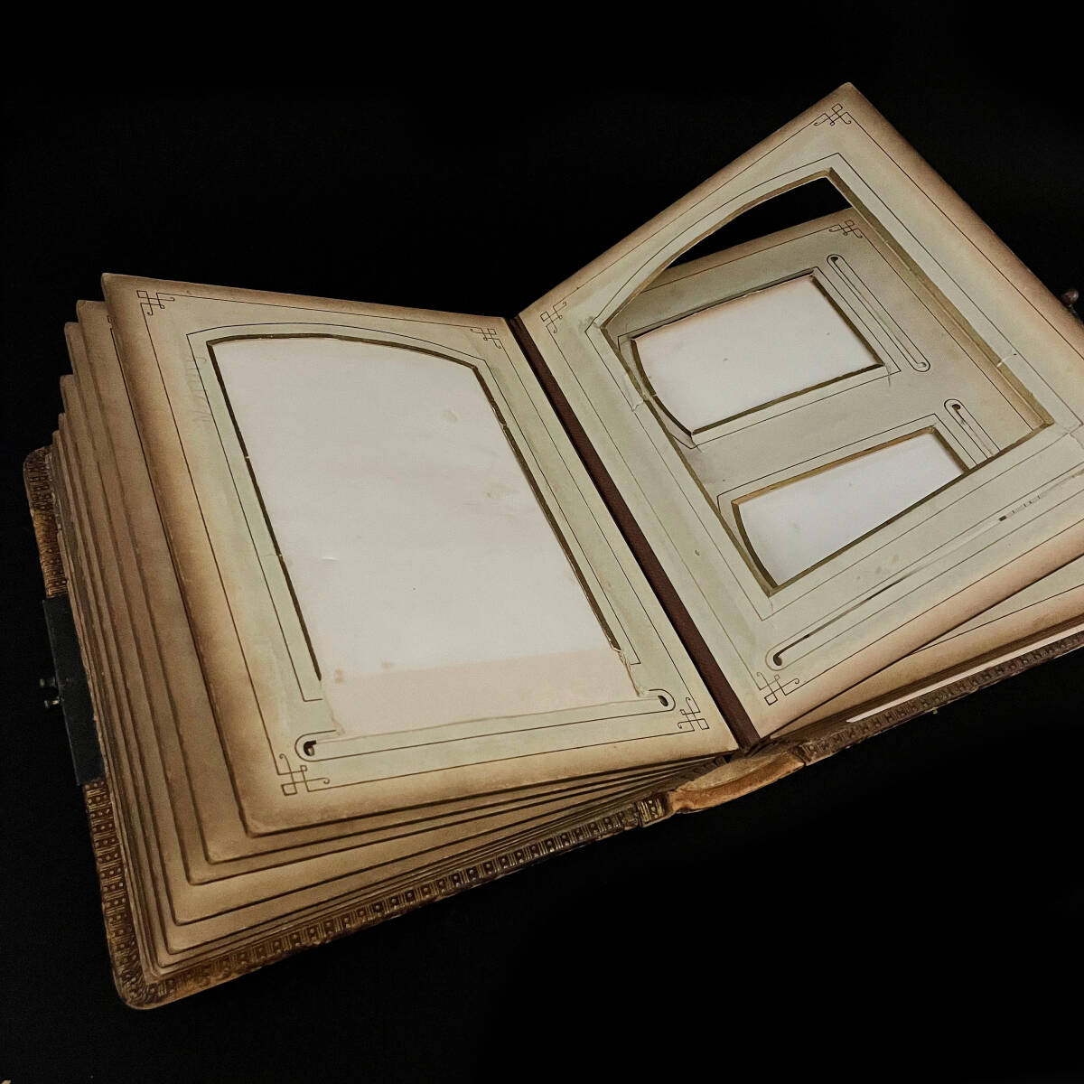 年代物のため、レザーにスレや小傷等の傷みがあり、 台紙にも破れやシミ等ございます。 商品画像をよくご覧になり、 古い物にご理解頂ける方ご検討ください。 ●サイズ:高さ 21cm、幅18cm、奥行6.5cm (誤差はご了承ください) |