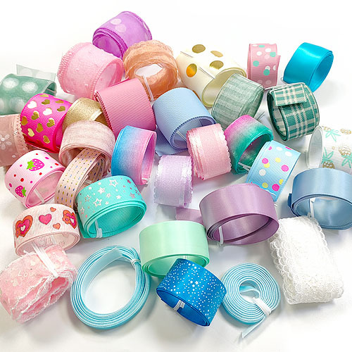 オーガンジー、サテン、プリント、レース等様々なリボンテープが30種類入ったアソートセットになります。