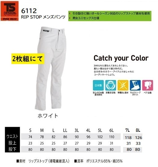 ビックイナバ特価◆TSDESIGN 6112 RIP STOPメンズパンツ【05ホワイト・Mサイズ】定価1枚7480円の品が、2枚組で即決2980円