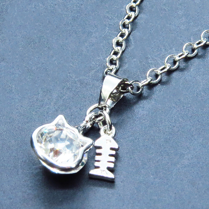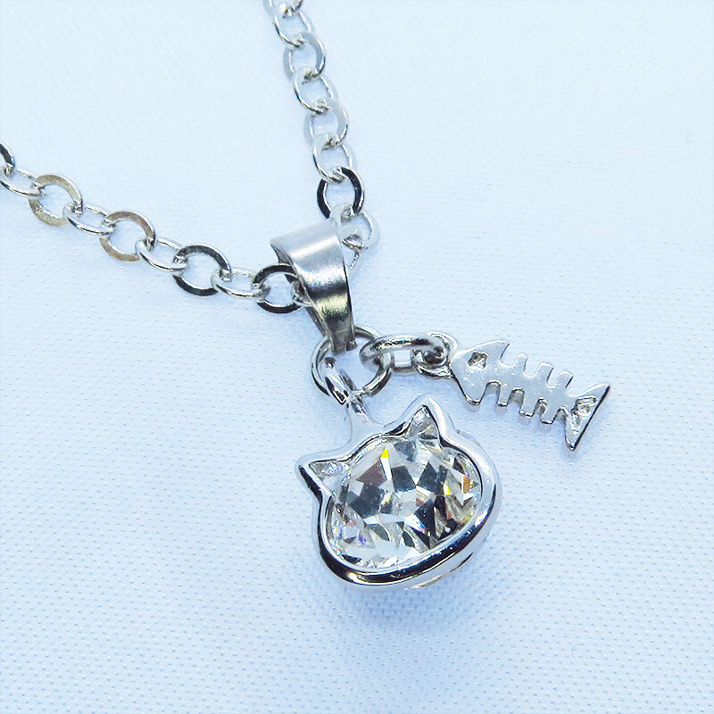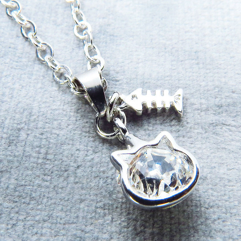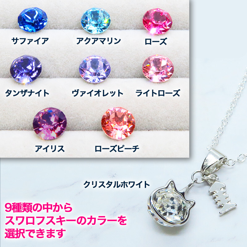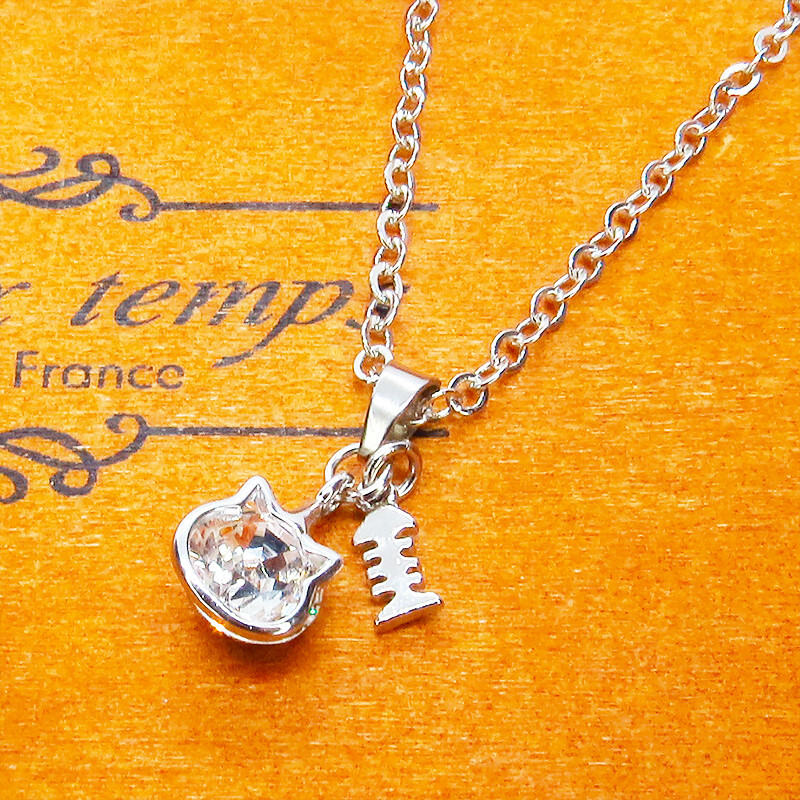 可愛い猫フレームのスワロフスキー(9色選択)と魚のチャームの大人可愛いネックレス 長さ調整可 アジャスター可