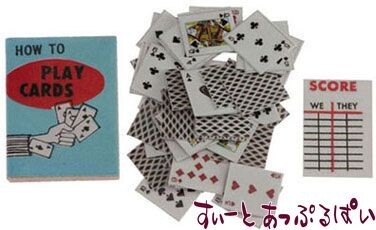 トランプのミニチュアです!ハウツー本と点数表も付いてます!暇を持て余し気味の、貴方のドールにぜひ!※ハウツー本は木製で、ページは入っていません。スコアシートとカードは紙製です。ハウツー本のサイズ:18x24mm、厚み2mm。トランプカードのサイズ:9x8mm。スコアシートのサイズ:17x11mm