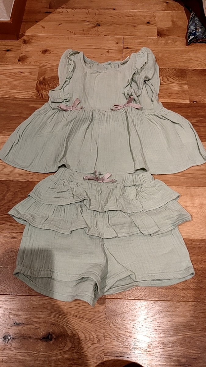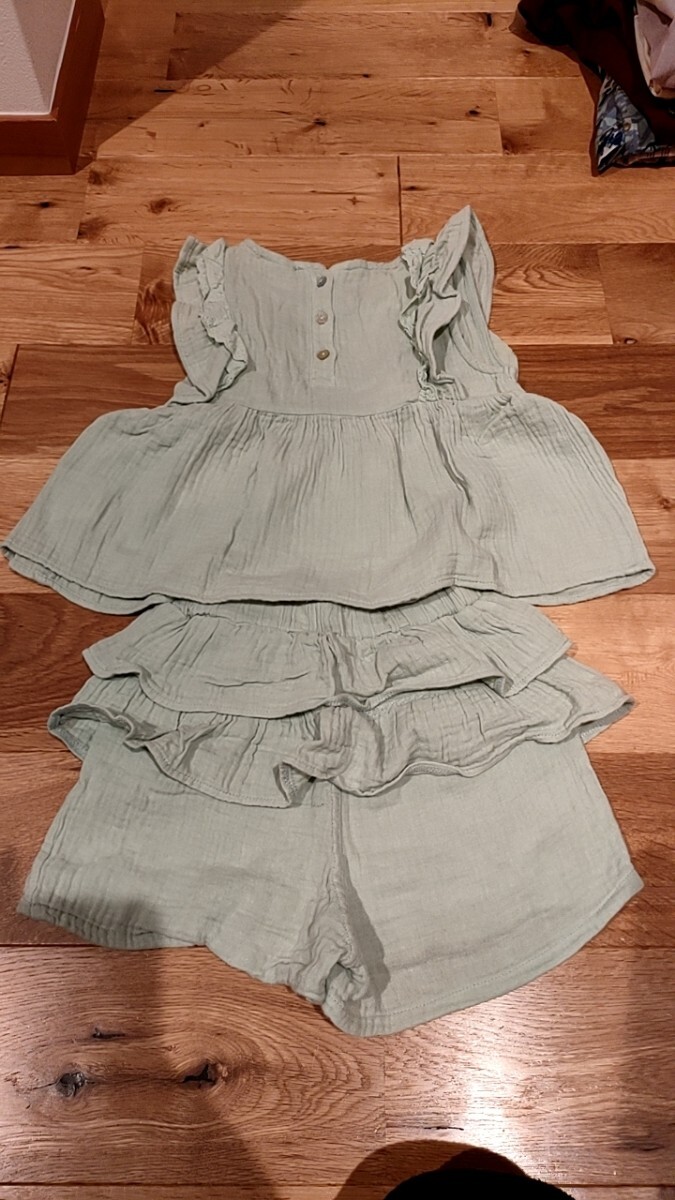 綿100%でとても柔らかくミントグリーンが女の子らしいとても可愛い服です。セットで着ても単品で着ても使い勝手がいいと思います、
