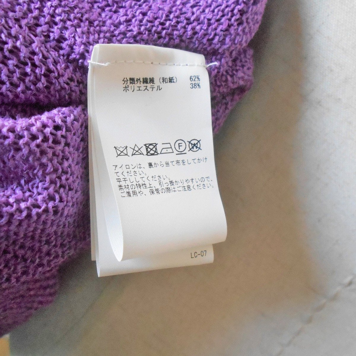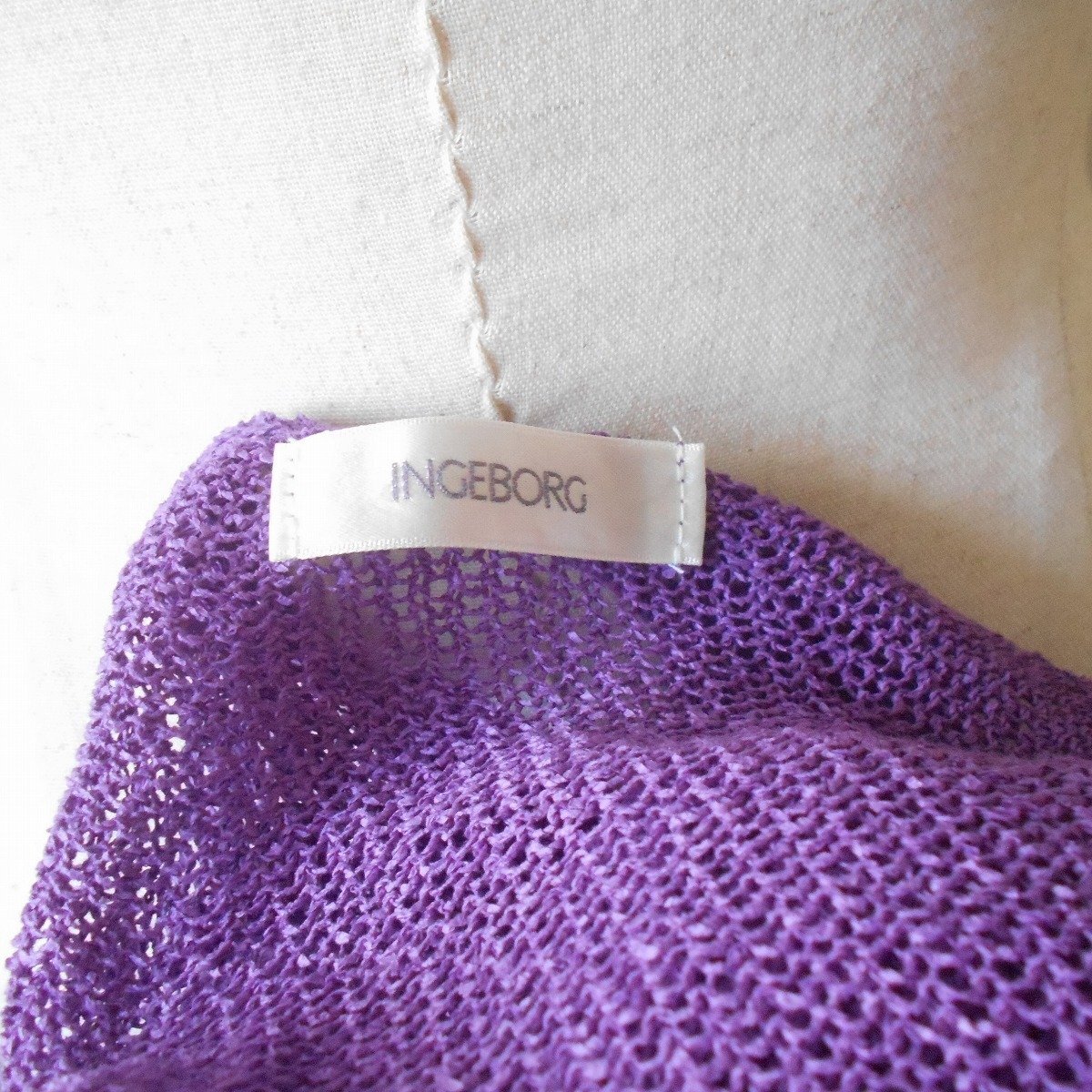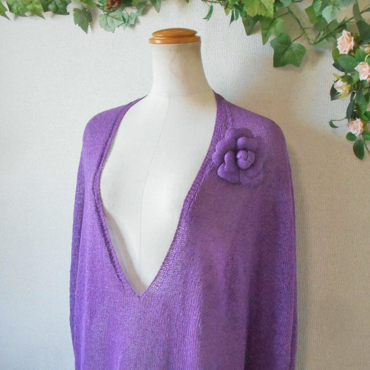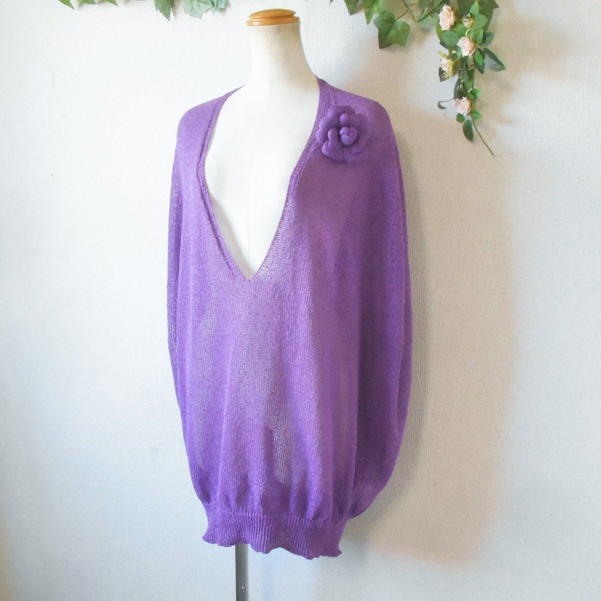 【ポイント】インゲボルグの和紙62%使用の夏向きニットになります。お色はパープル系で同素材使用のコサージュが付いています。デザイン的にはノースリーブですが、身幅が広いため肩が落ち、半袖くらいになると思います。
