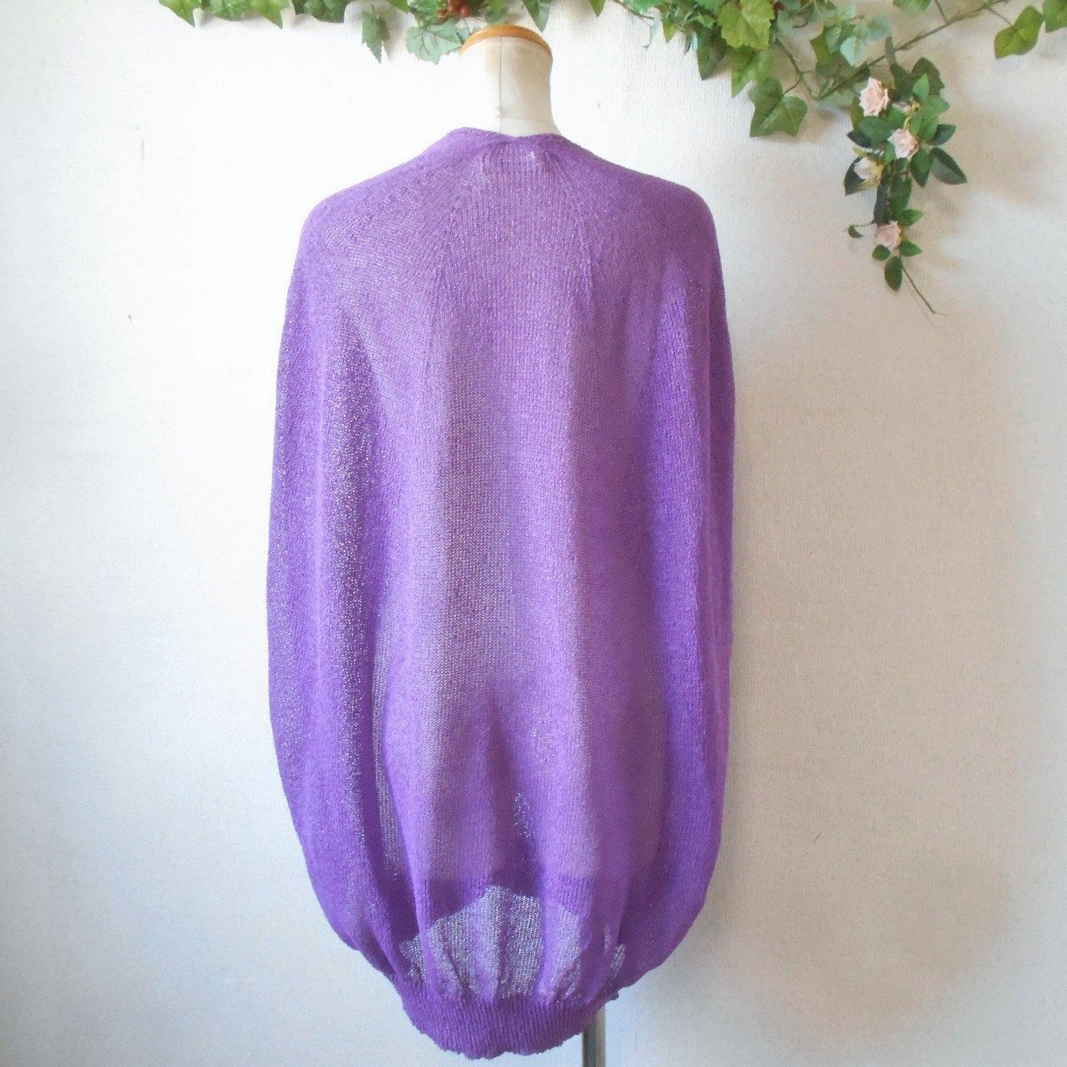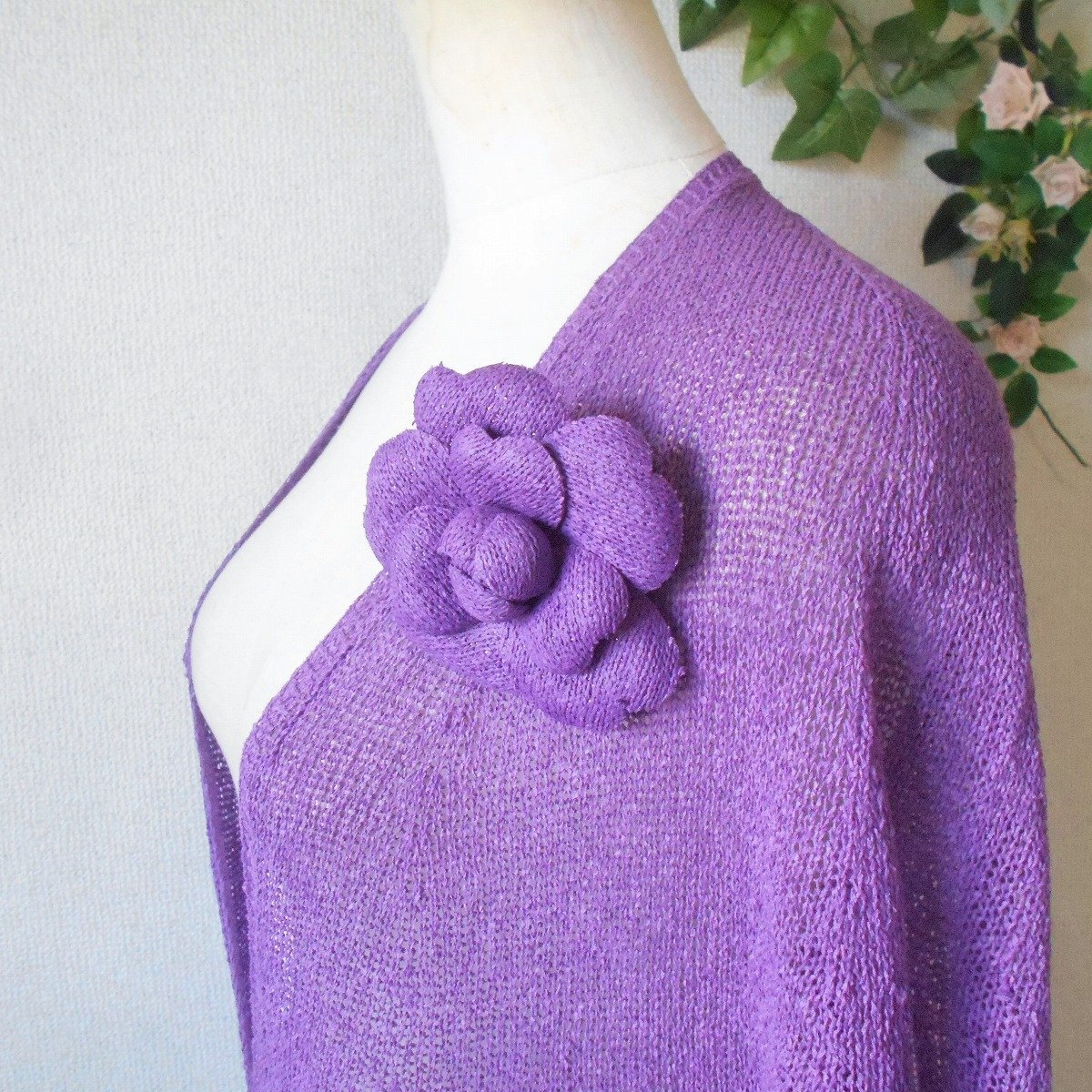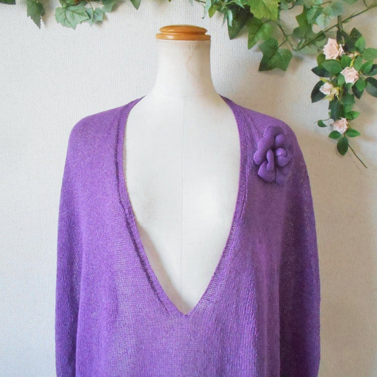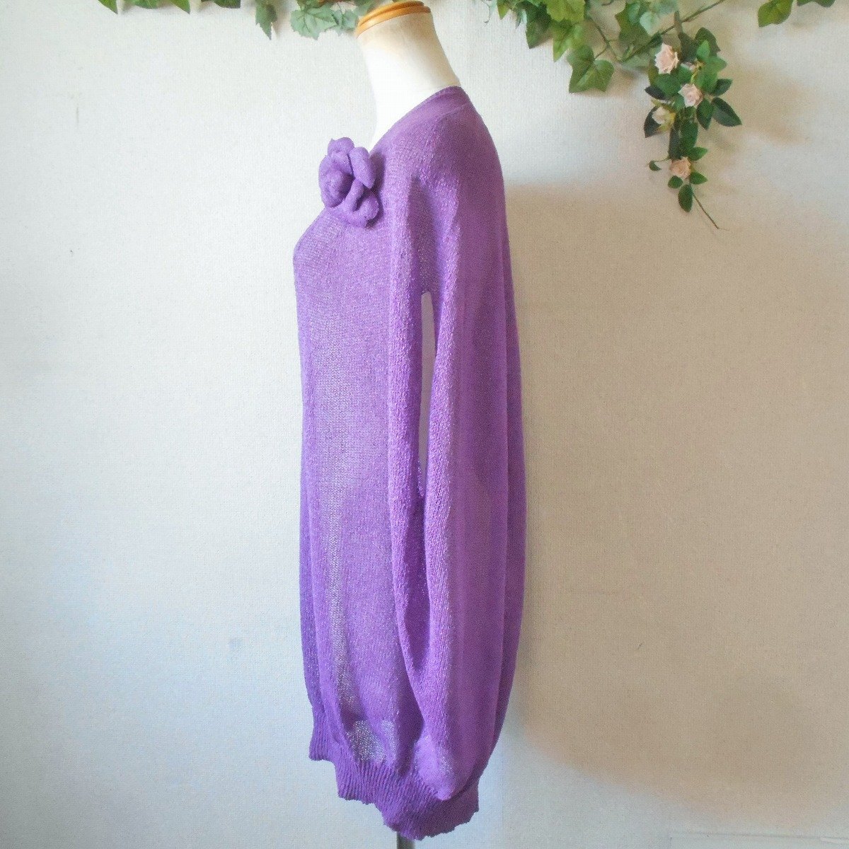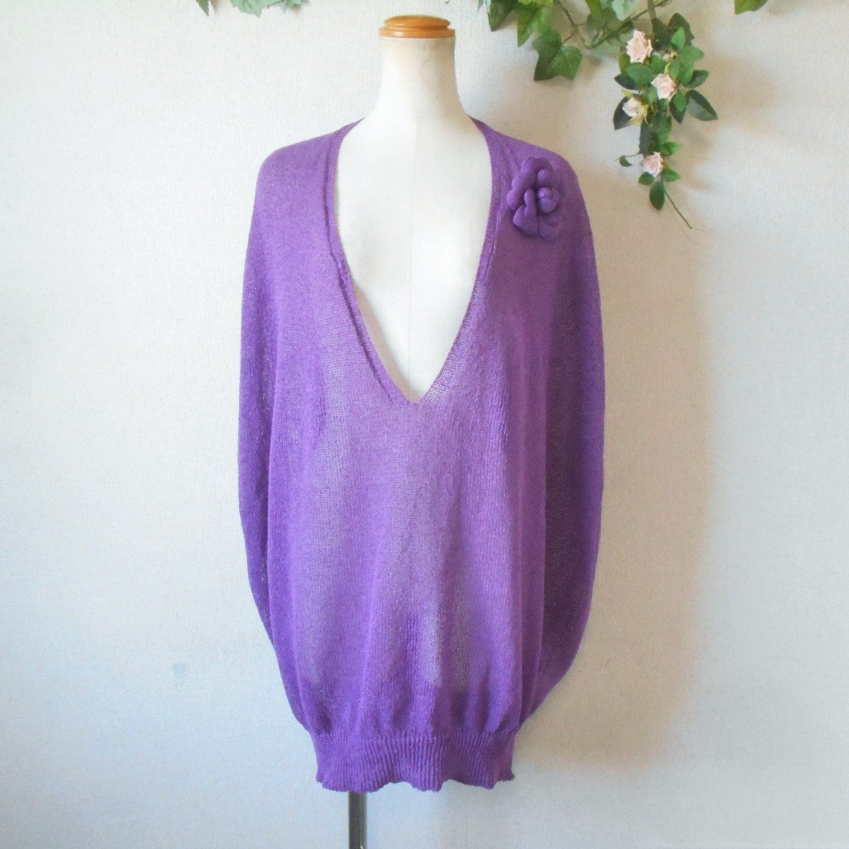 【ポイント】インゲボルグの和紙62%使用の夏向きニットになります。お色はパープル系で同素材使用のコサージュが付いています。デザイン的にはノースリーブですが、身幅が広いため肩が落ち、半袖くらいになると思います。