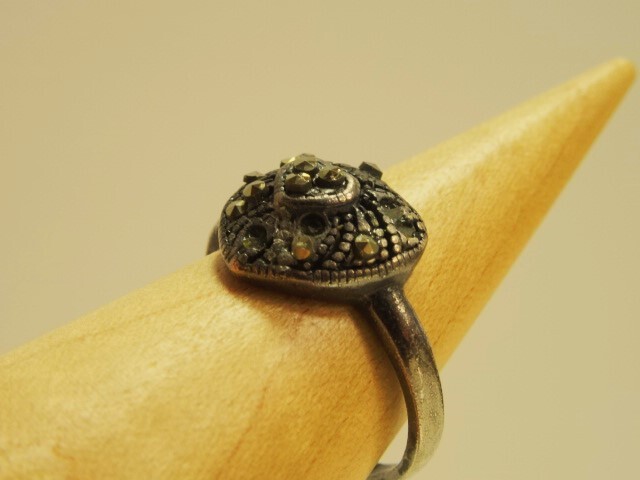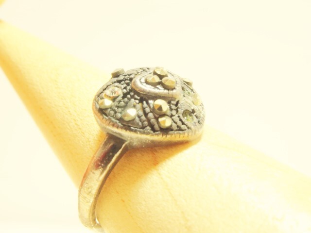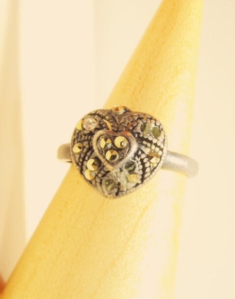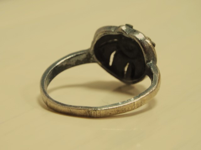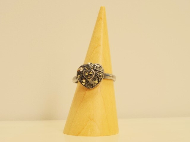 ハート型リング 指輪 ラインストーン ヴィンテージ風 アンティーク風 インレイ風 レトロ ゴシック 12号 燻し風銀色 オールド USED 中古