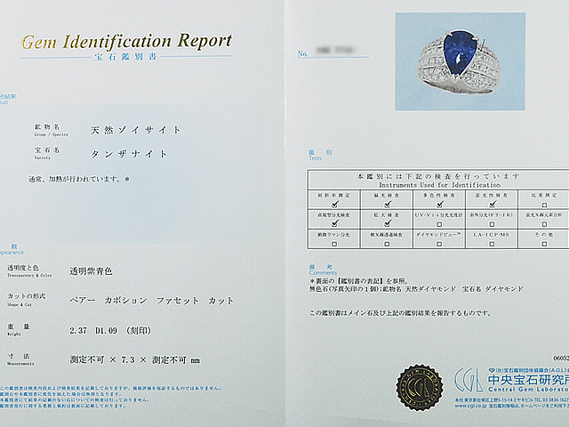 備考:ルーペで見るとタンザナイト表面にわずかなスレ、ダイヤに微細な傷、地金部分に微細なスレや小傷が見られます。お付けになられて目立つような傷はなく、状態の良いお品物となっております。