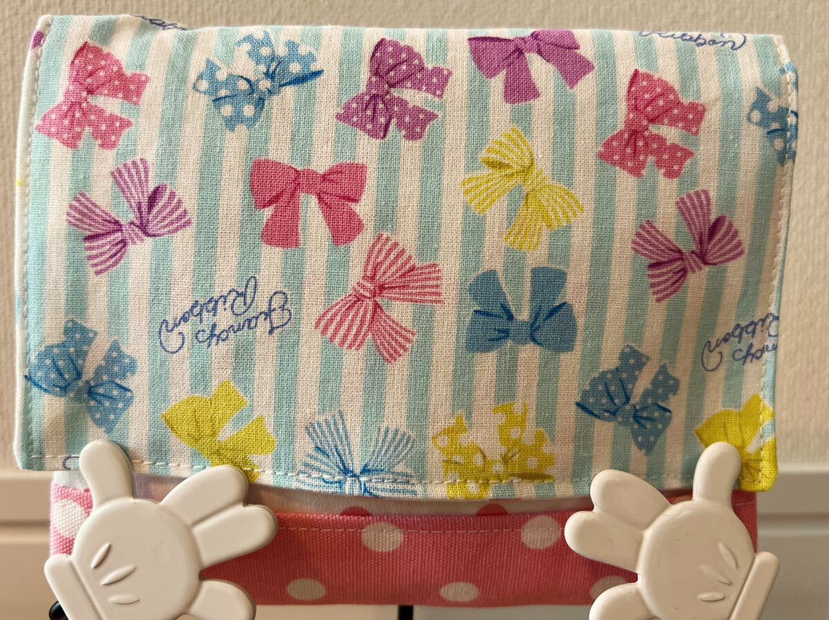 ストライプ地にカラフルなリボン柄の綿生地で移動ポケットを作りました。