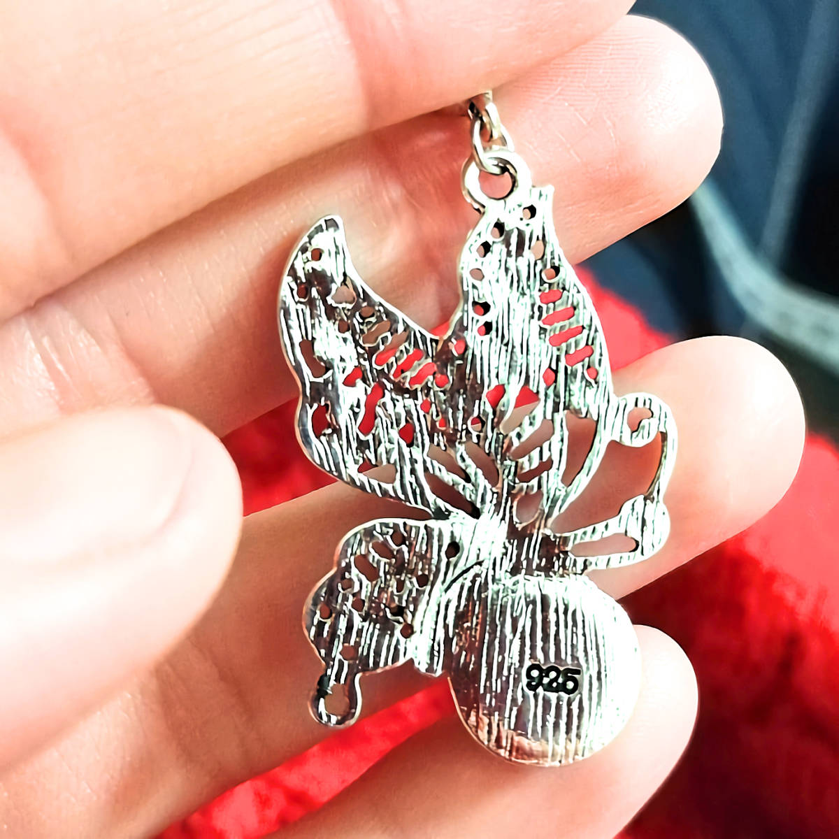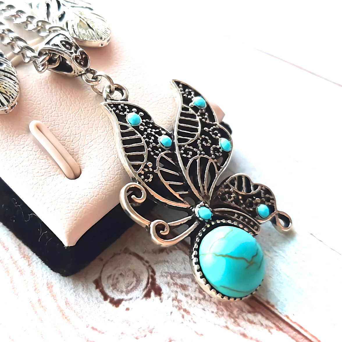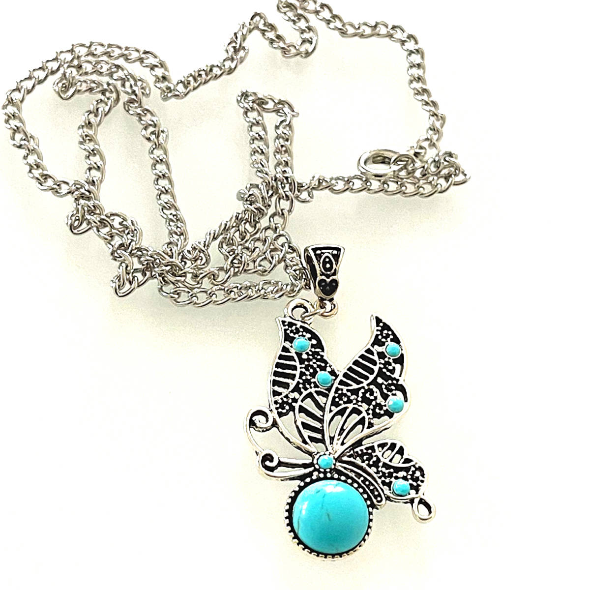 こちら蝶々を象ったブルーが眩しいターコイズプラチナ仕上げ925シルバーネックレスとなります。