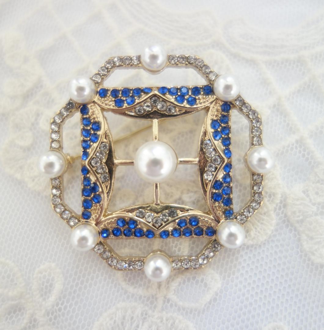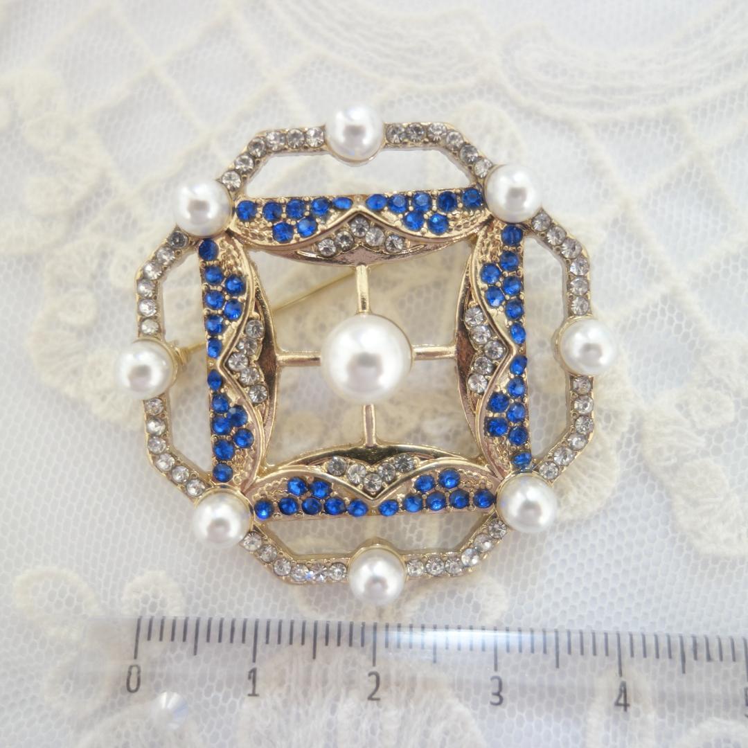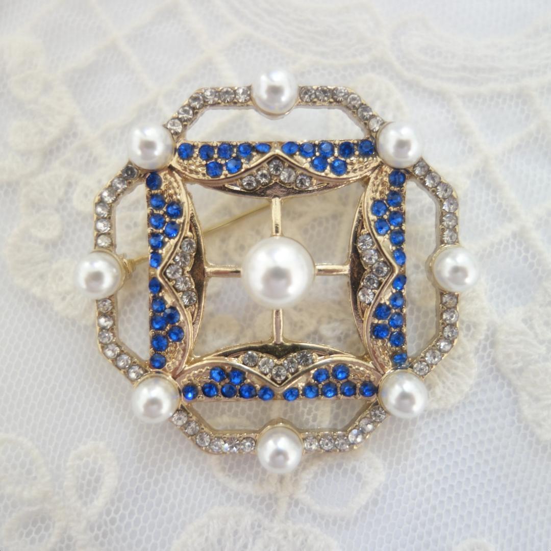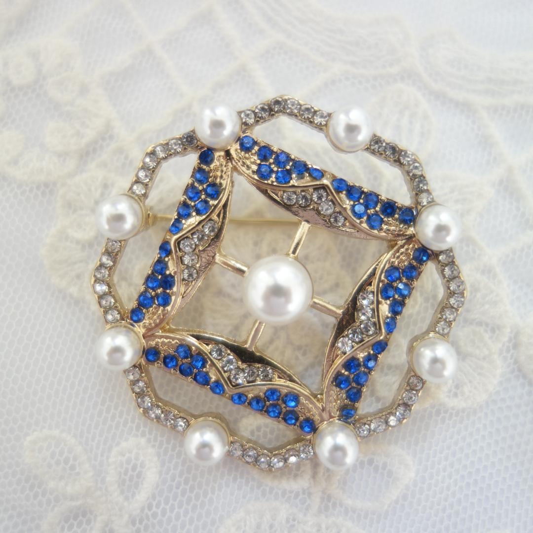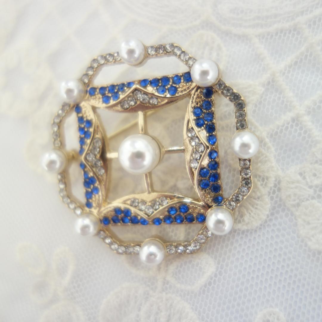 繊細 デコ アンティーク調 サファイア色&クリア輝石 パール ブローチ