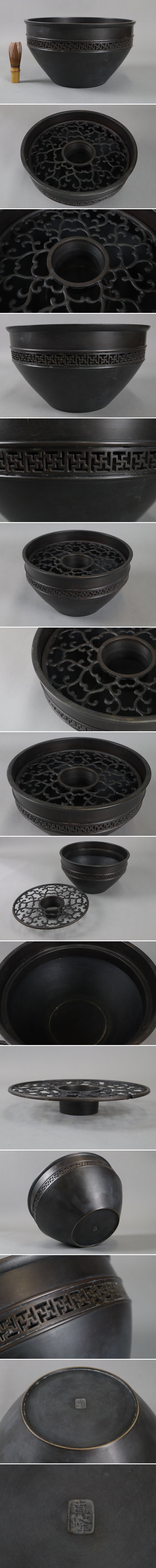 時代金工 金工師 真峰造 銅製唐草卍透丸形 花瓶 径30,5cm 花生 水盤 細密細工 古美術品[c607]