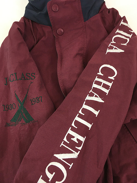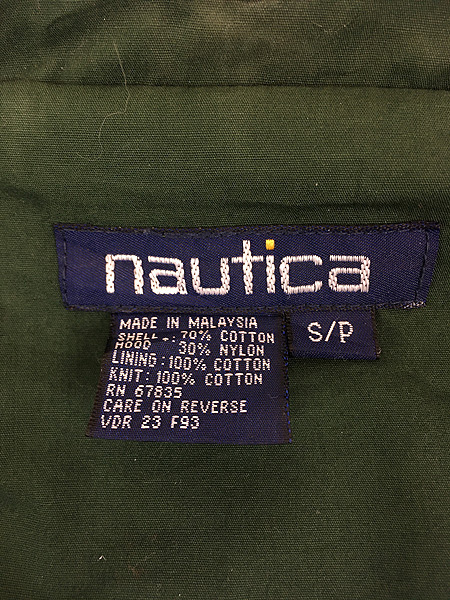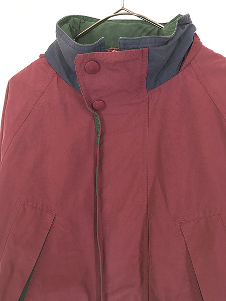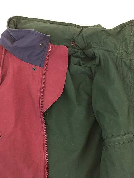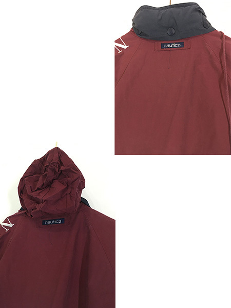 ハリのあるコットン&ナイロン地、首裏収納フード、フードはドローコードで調節可能、フロントはスナップボタンとジップの二重構造。