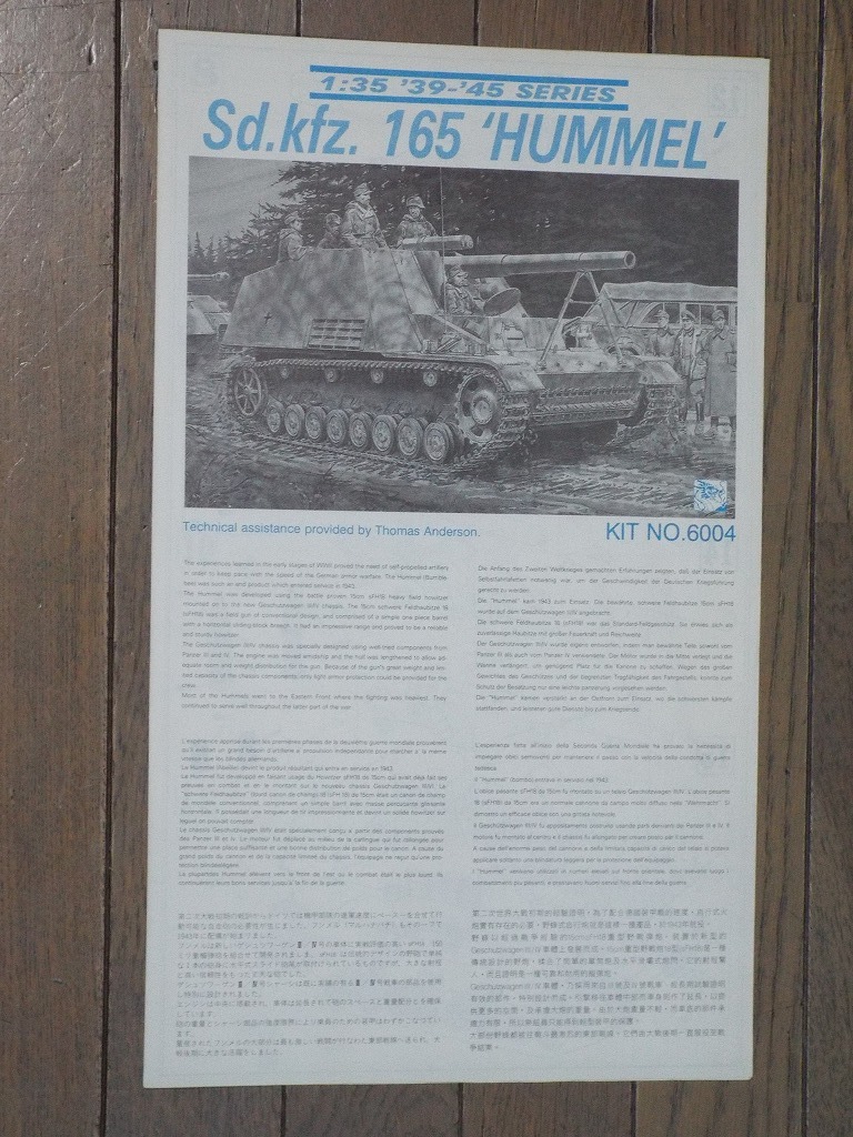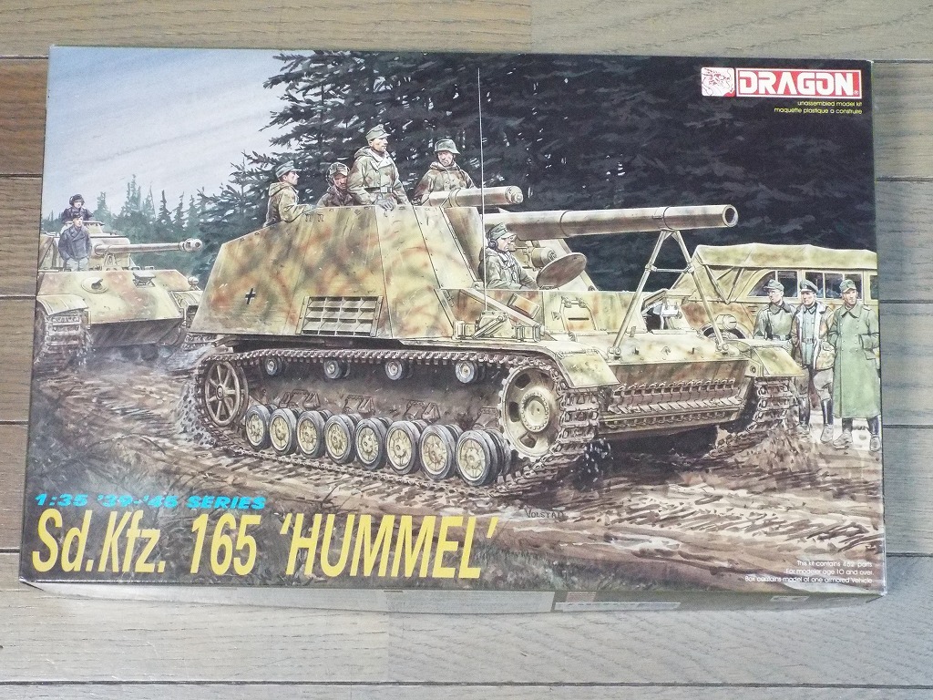 Sd.Kfz. 165 Hummelは、口径 150 mm の榴弾砲を搭載した自走砲です。キットは、ドラゴン1/35 Sd.Kfz. 165 フンメル # 6004です。中袋未開封です。デカールは、初期の製品のため透明部分が変色しています。履帯は連結式です。キット重量は530g、箱のサイズは縦横高さの合計69cm80サイズ)です。箱がやわらかいのでダンボール包装で送ります。送料無料です。送付方法はゆうパックです。京都府大山崎町から発送します。コロナ禍の折、手渡しはいたしません。