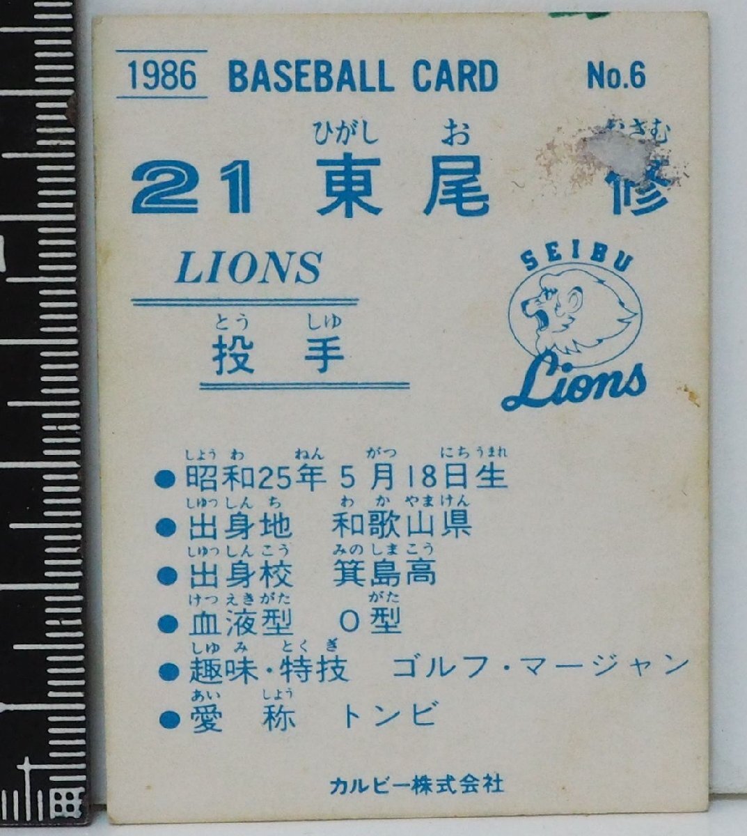 86年 カルビー プロ野球カード No.6【東尾 修 投手 西武ライオンズ】昭和61年 1986年 当時物 Calbee おまけ 食玩 BASEBALL【中古】