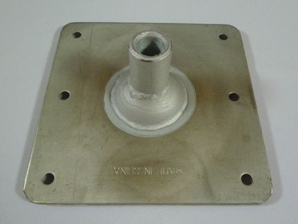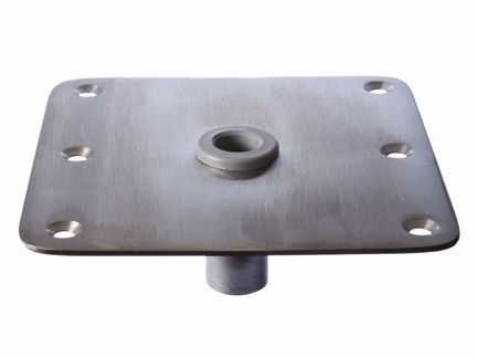 バスプロショップのデッキベースです。スレッド(ねじ山)無しのタイプです。ボートシート用のポールやパワーポストをデッキに差し込むためのベースで、写真のフラットな面が上になり、凸がある面が下になります。ピン穴の直径は一般的に流通している3/4インチ(19mm)ですので、KingpinとLock'n Pinのポール・ポストが装着可能です。ステンレス製で、サイズは17.5cm×17.5cmです。またピンの長さ(深さ)は61mmになります。またスレッド(ネジ山)のあるポストも装着可能です。