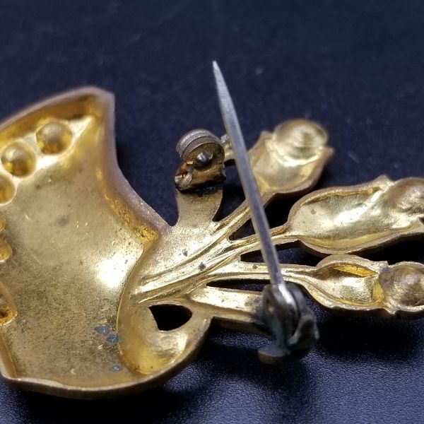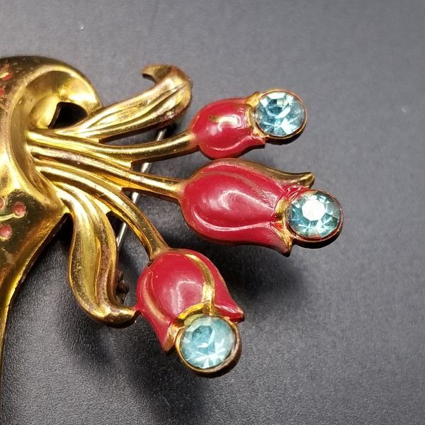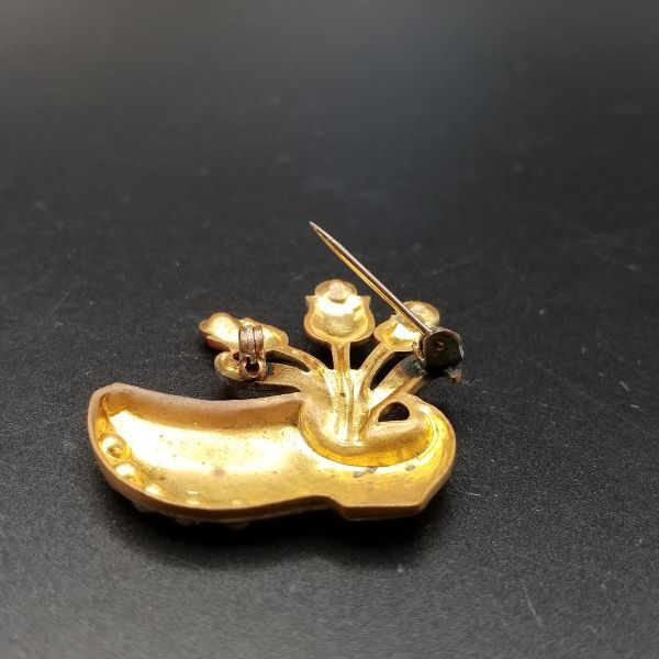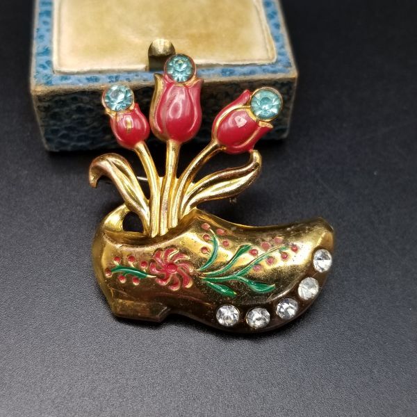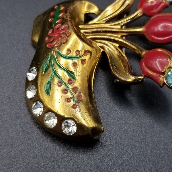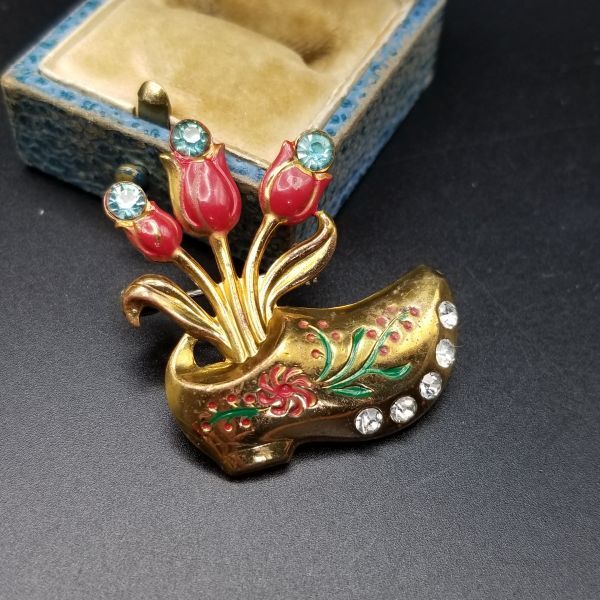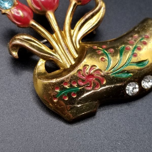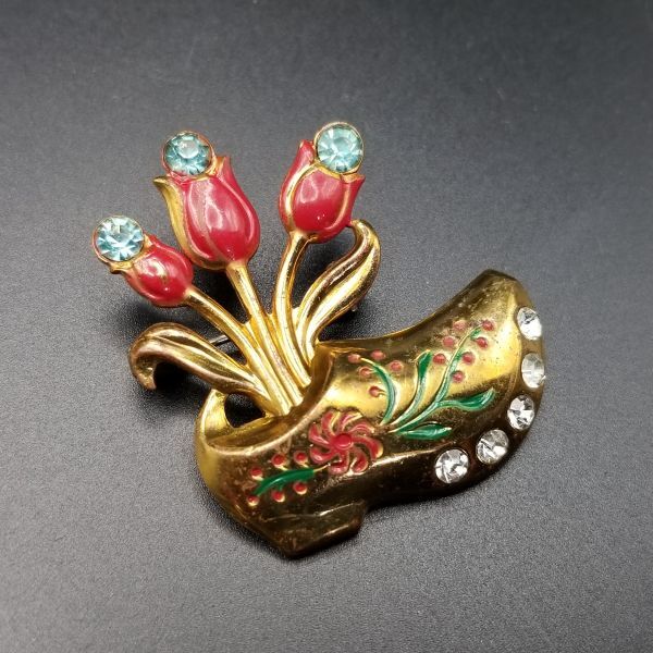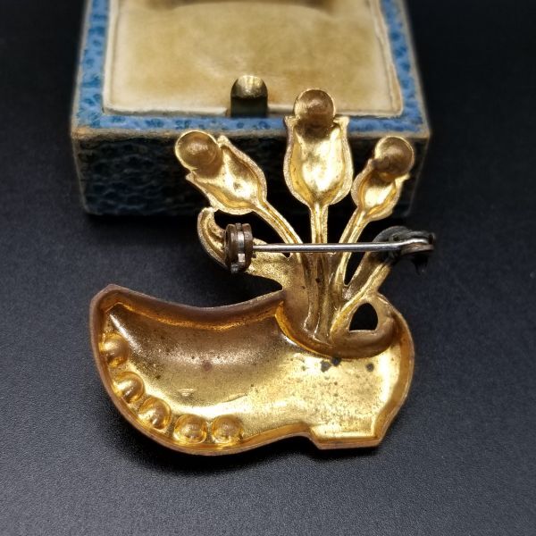 オランダモチーフ チューリップと木靴 ヴィンテージ ブローチ フローラル ペイント ゴールド/レッドトーン レトロキュート AJH