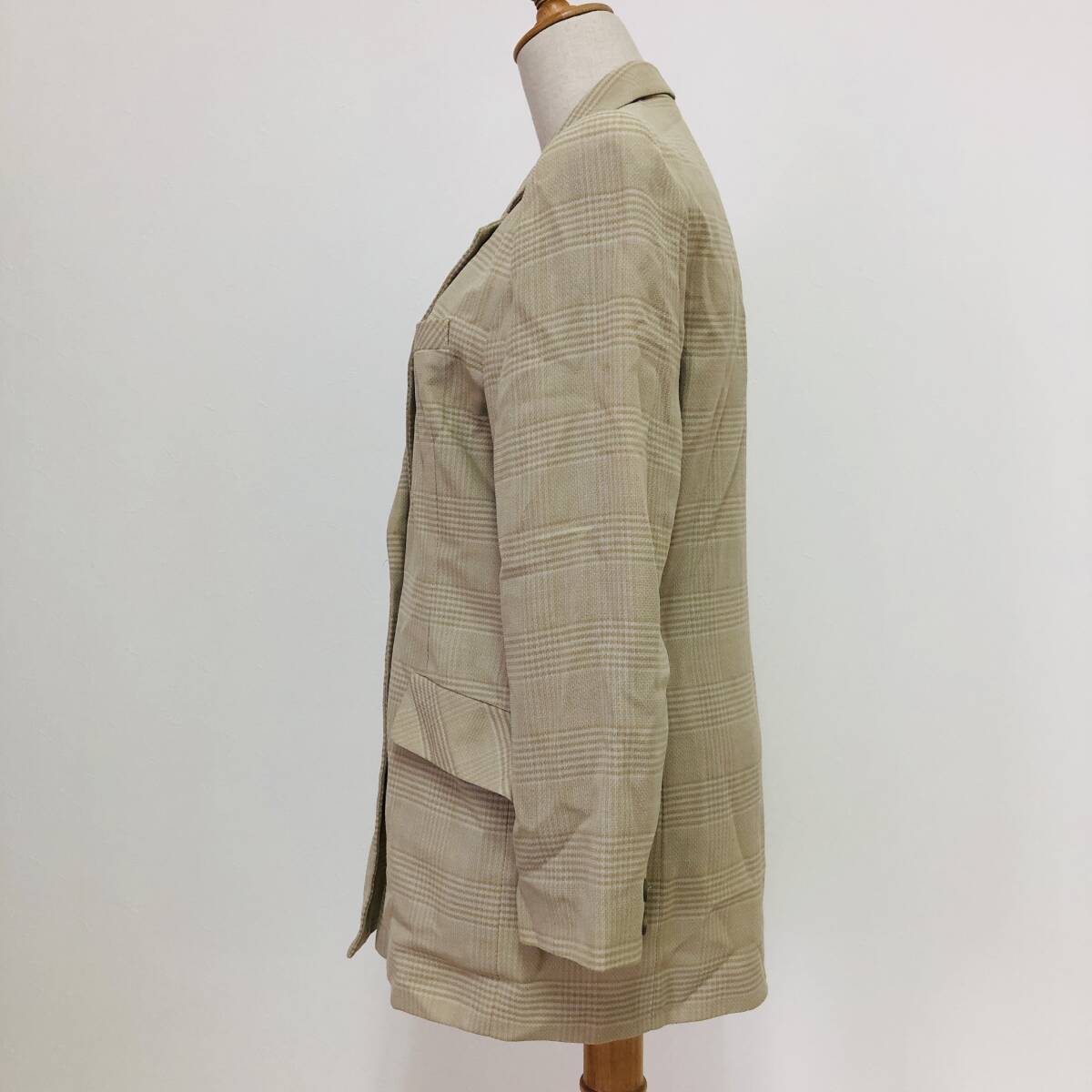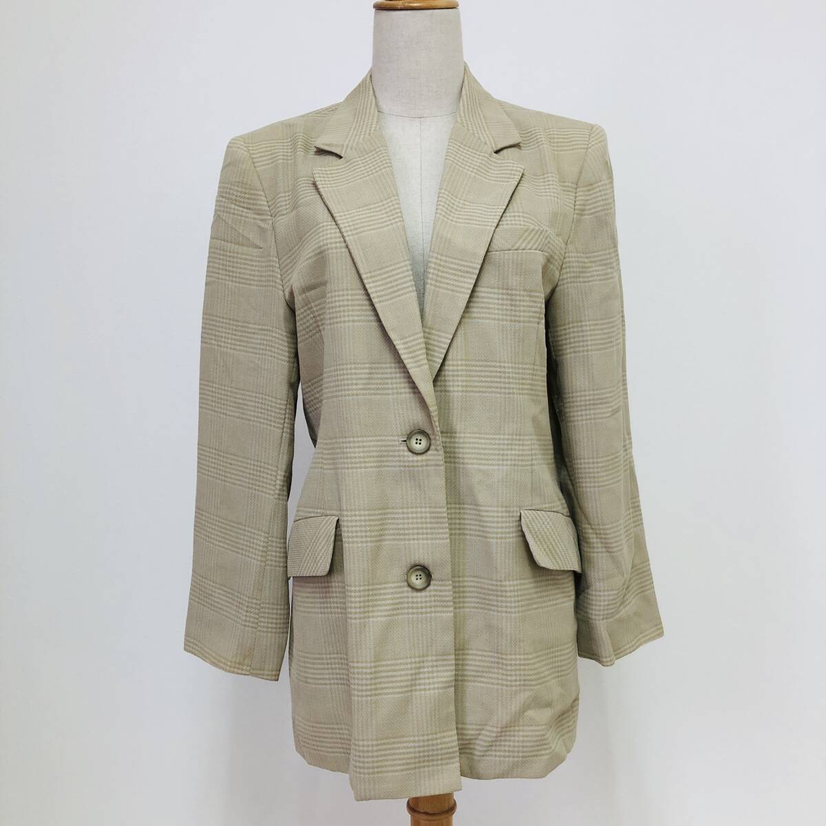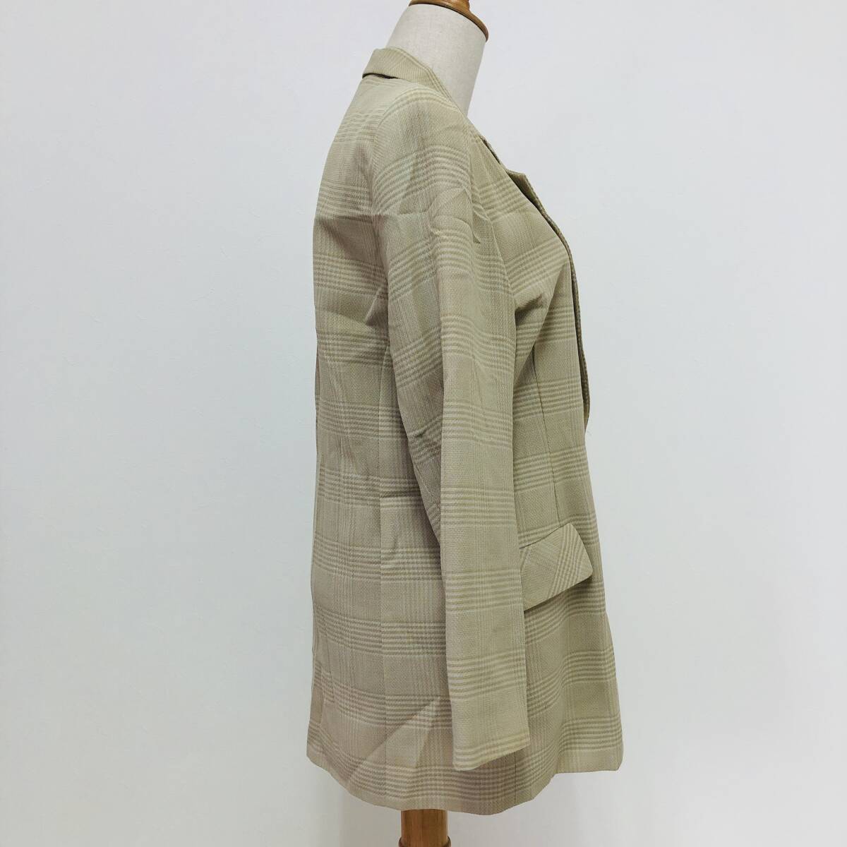 a03855 PiSUKU ジャケット シングル 肩パット 毛混 日本製 ポケット 裏地 M ベージュ チェック レディース ベーシックカジュアルスタイル