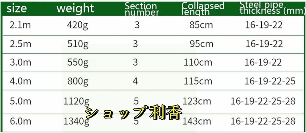 2.1m(7ft)、2.5m(8ft)、3m(10ft)、4m(13ft)、5m(16ft)、 6m(19.7ft) 伸縮ポールで、フルーツピッカーは格納時に簡単にトランクに収まることができる複数のサイズが利用可能:簡単に運ぶことができます、ブーツに簡単に収まる