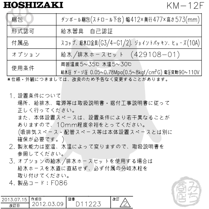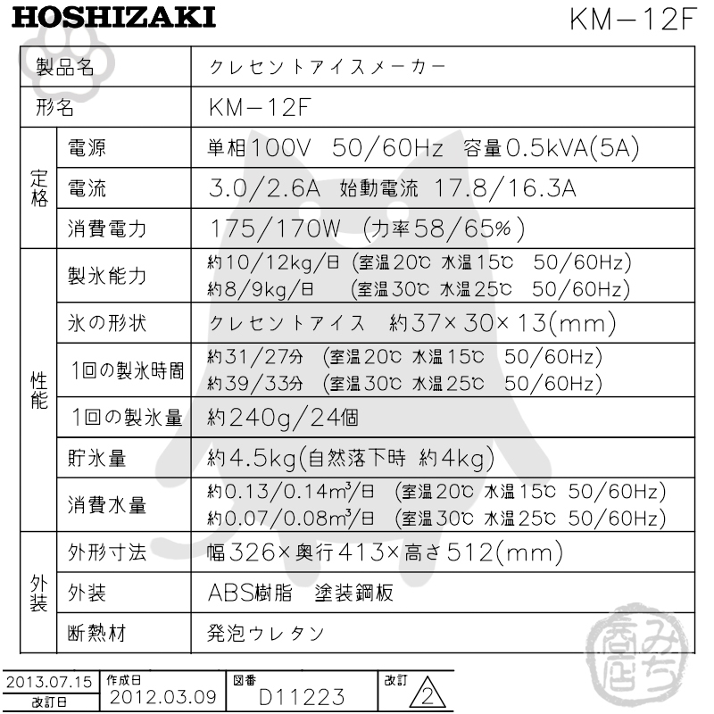 KM-12F ホシザキ 製氷機 クレセントアイス 卓上タイプ 幅326×奥413×高512mm