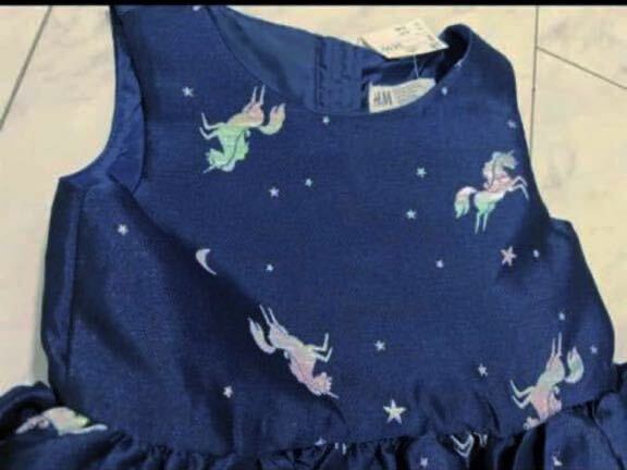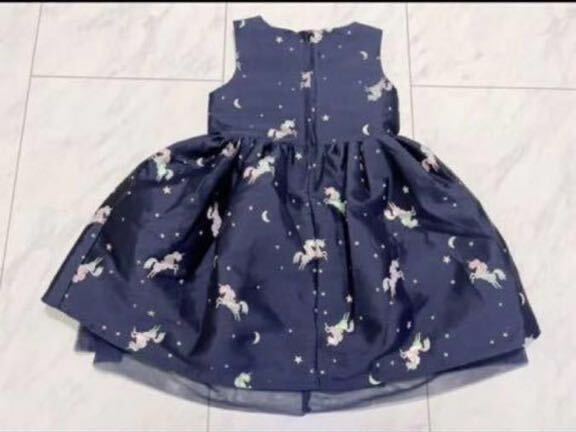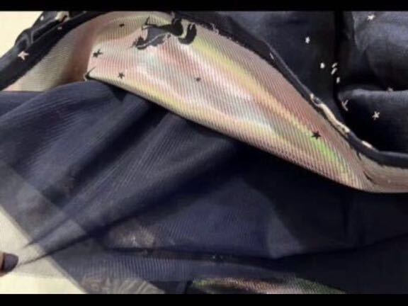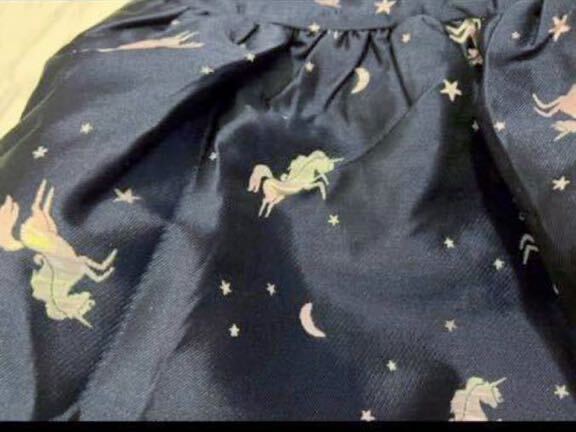 張りのある、わりと厚手のネイビー生地に7色に光り輝く、月・星・ユニコーンが織り込まれたゴージャスなワンピースドレス、スカートの下からのぞくオーガンジーは裏地の上に2重になっていて、細かいデザイン力のある素敵なお品です。