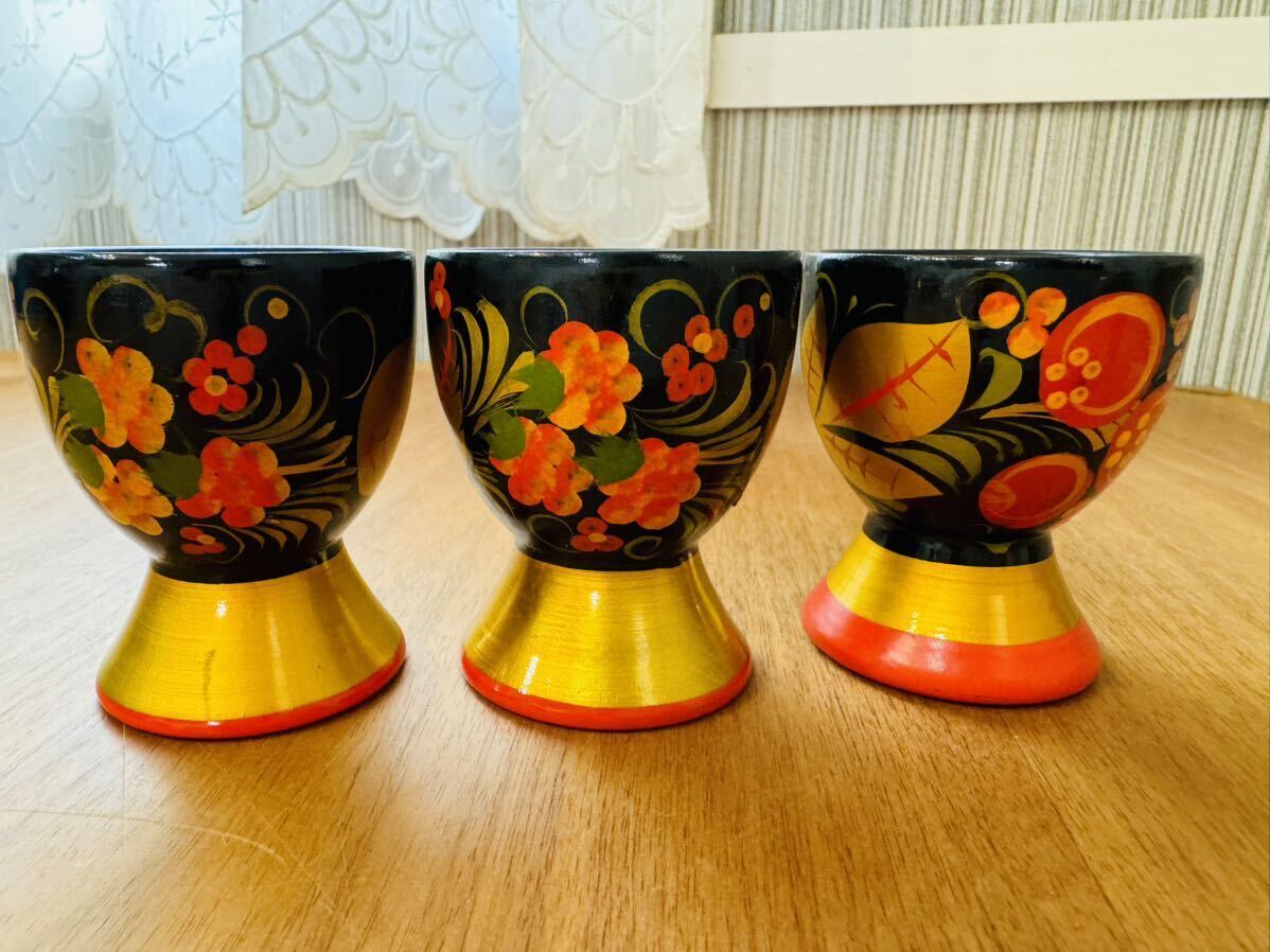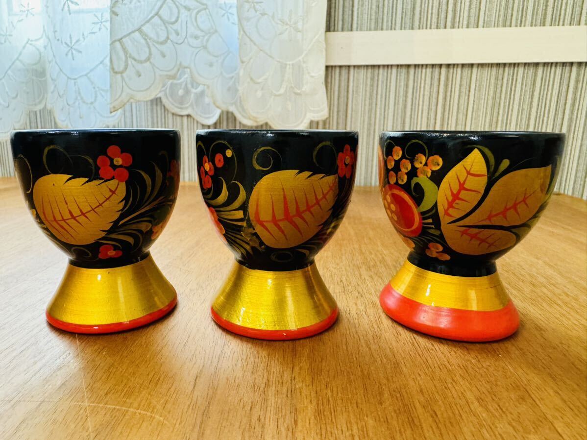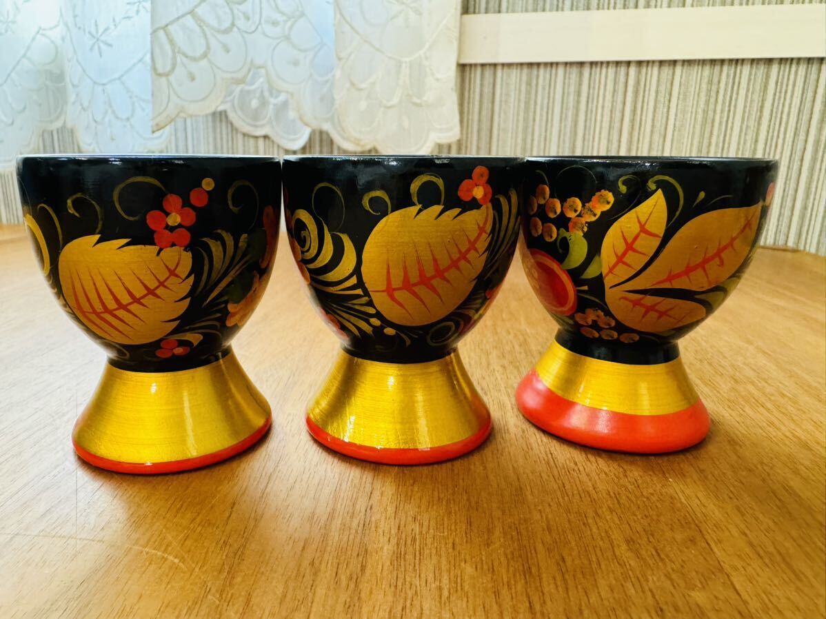 ロシア民芸品 ホフロマ塗り 器 木製 乾杯グラス 3個セット まとめて