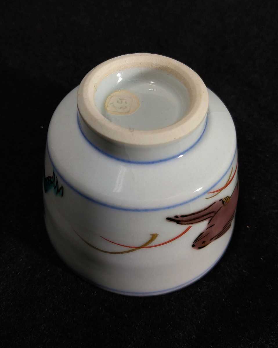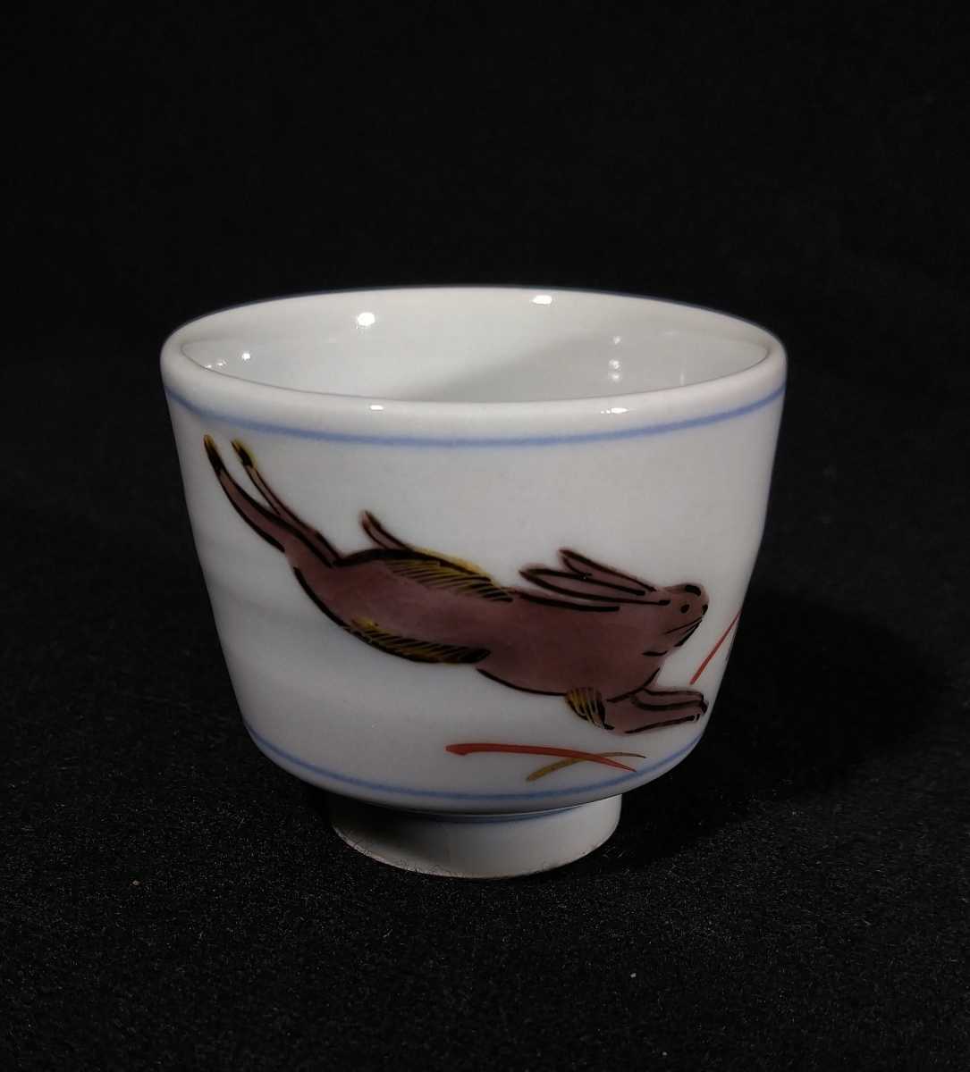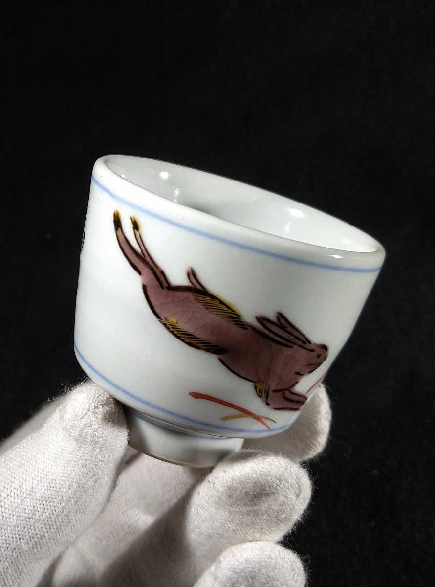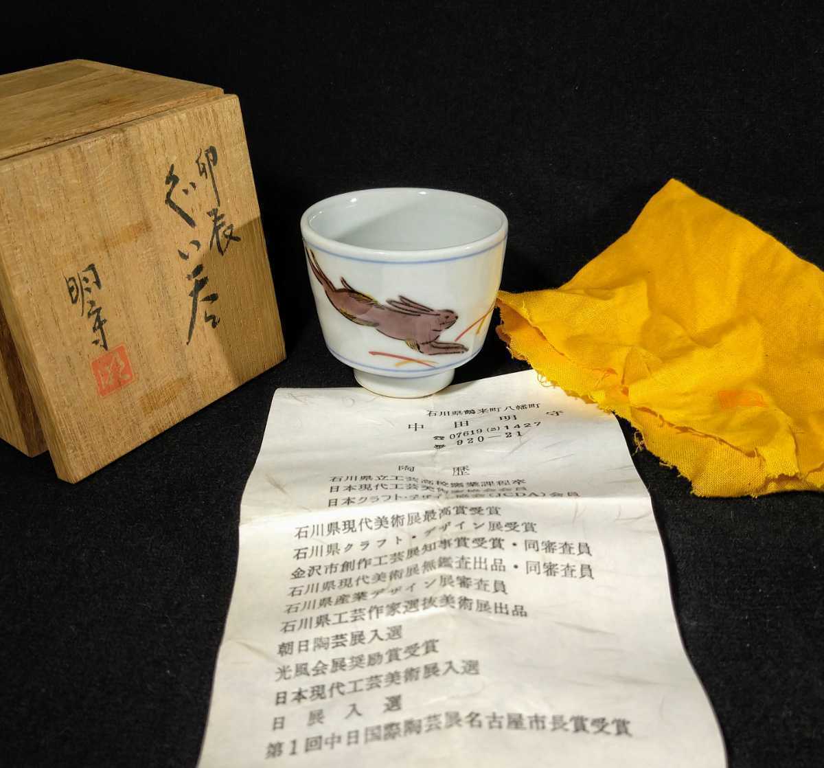 躍動感溢れる兎とコミカルな龍が描かれた、中田明守(1934-)先生の美しい酒盃でございます。底に小さなニュウがございます。素人採寸で申し訳ございませんが、径