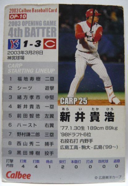 カルビープロ野球カード2003年OP-10【OPENING GAME 荒井 貴浩(広島 東洋カープ)】平成15年チップスおまけ食玩トレーディングカード【中古】