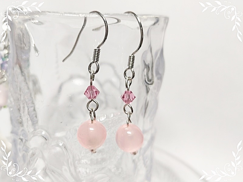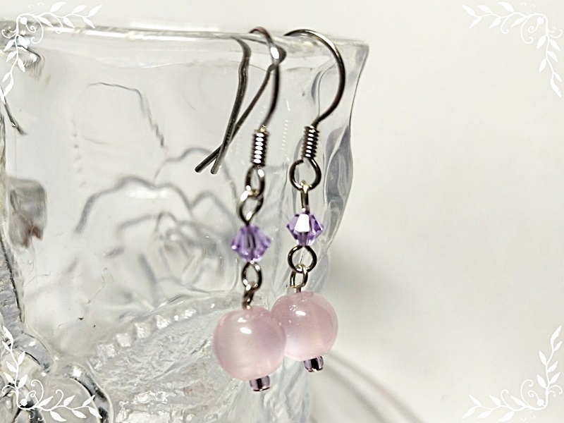 089:キャッツアイとスワロフスキーのフックピアス(ライトローズ)