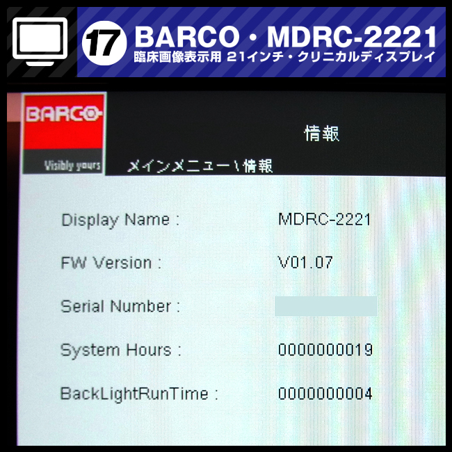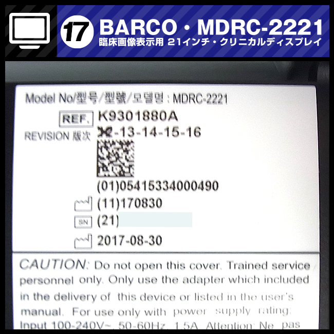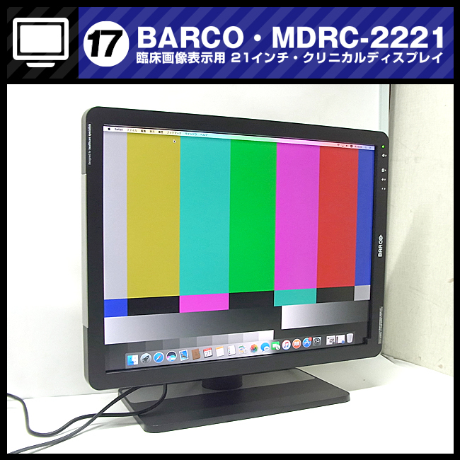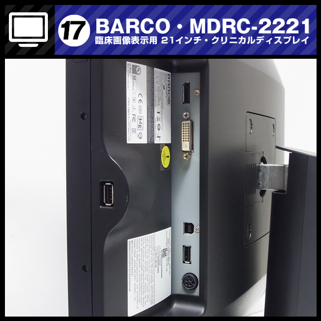 | BARCO・MDRC-2221 21インチ 放射線技師向けクリニカルディスプレイ ーーーーーーーーーーーーーーーーーー ■System Hours:19時間 ■BackLightRunTime:4時間 予備機だったようでSystem、BackLightともに極短時間です ーーーーーーーーーーーーーーーーーー ・メーカー:BARCO ・型 番:MDRC-2221 ・品 名:EONIS 21インチ ・製造年 :2017-08-30 ・解像度 :1600x1200(2MP) ・入力信号:DisplayPort、DVI ーーーーーーーーーーーーーーーーーー ●フロント・センサーを装備で自己キャリブレーション機能付き ●周囲光読影室の選択可能(暗室、手術室、オフィスなど照明条件に対応) ●ピボット機能(タテ表示)付き ●DisplayPort、DVIともに動作確認済み ●画面表示は明るくキレイで動作良好です ●現状で発色ムラ・焼け、映像のブレ等は無く基本動作等に不具合はなさそうです ※詳しい仕様などはメーカーサイトをご参照ください。 メーカーサイト(マニュアルのダウンロードができます) メーカースペックシート(PDFです) ●外観について 本商品は中古品です 画面は問題あるような目立つ大きさの傷はありません 概ね綺麗ですが、外観使用感、経年・使用に伴う擦り傷/汚れが若干あります 外観等を著しく気になさる方や新品に近い美品をご希望の方はご遠慮ください ●付属品 MDRC-2221本体、ACアダプタ、電源コード(汎用品) ※記載以外の付属品はありません。 ※使用時間は前ユーザー様の使用目安として記載しています 動作確認中に使用時間が増える場合もあります。予めご了承ください ※前ユーザー様の使用環境を質問されても一切わかりません ※予備機、使用時間がごく短時間でも中古品です。新品購入時のメーカー保証はありません。 ●詳しい仕様等、商品についてはメーカーサイトなどをご参照ください。 ●動作確認は簡単なチェックまでです。全ての機能を確認したわけではありません。 ※保証期間内であっても,水没・落下などお客様が原因で起こった不具合は保証対象外です。 ※ハードウェア、ソフトウェアに関するサポートは行っておりませんのであらかじめご了承下さい。 | |||||||||||||||||||||