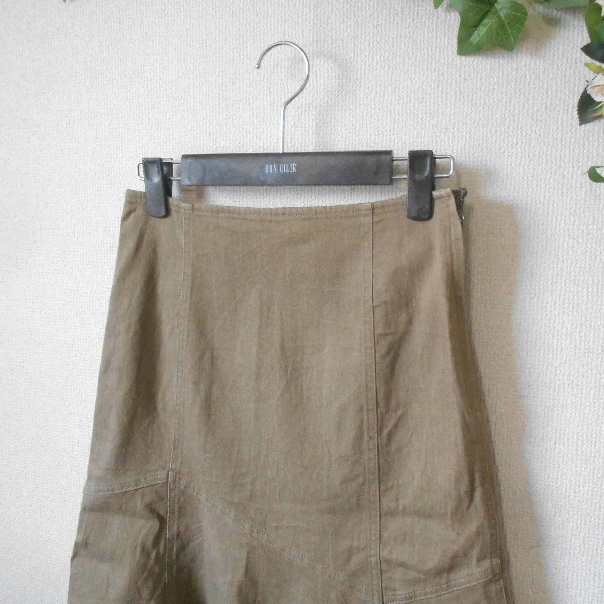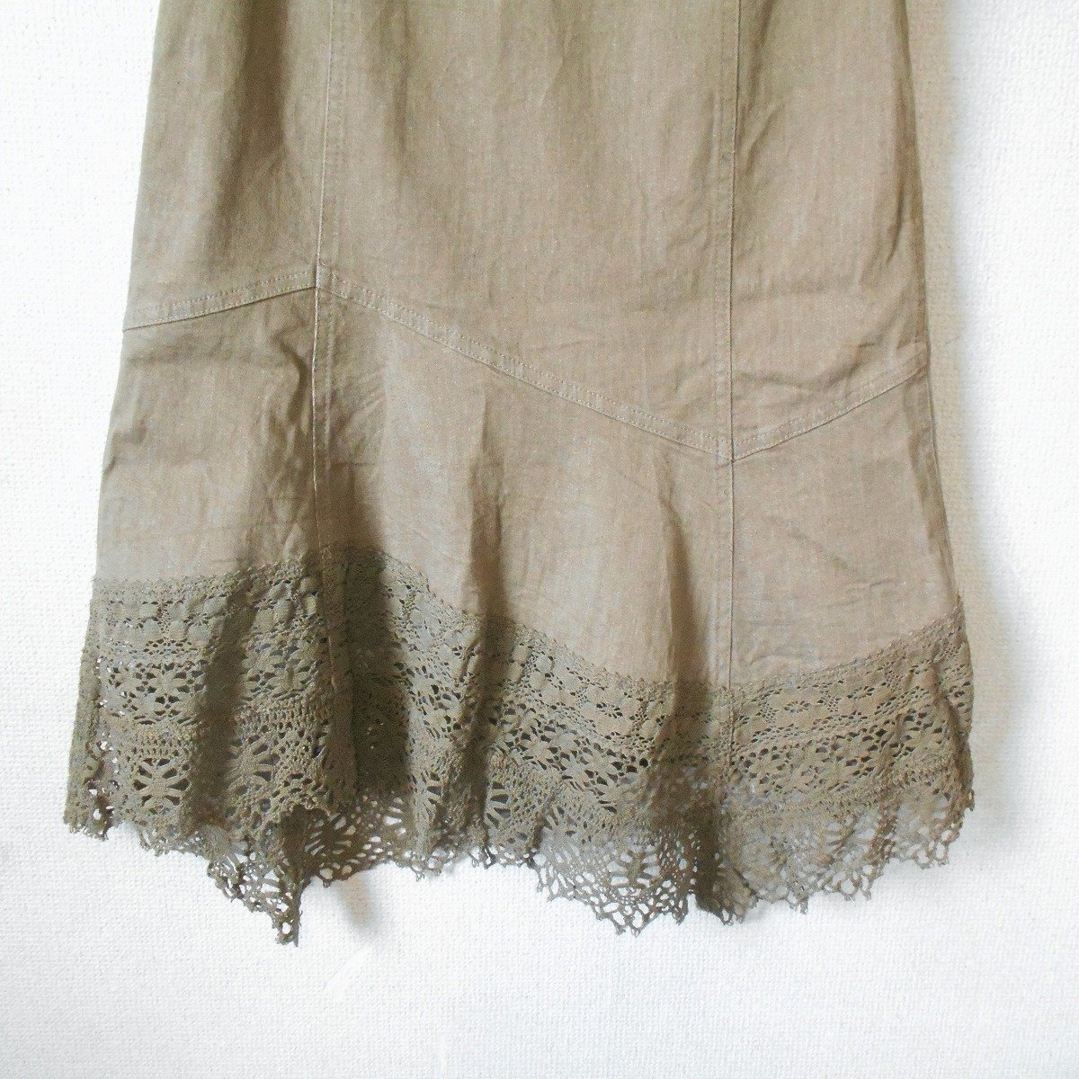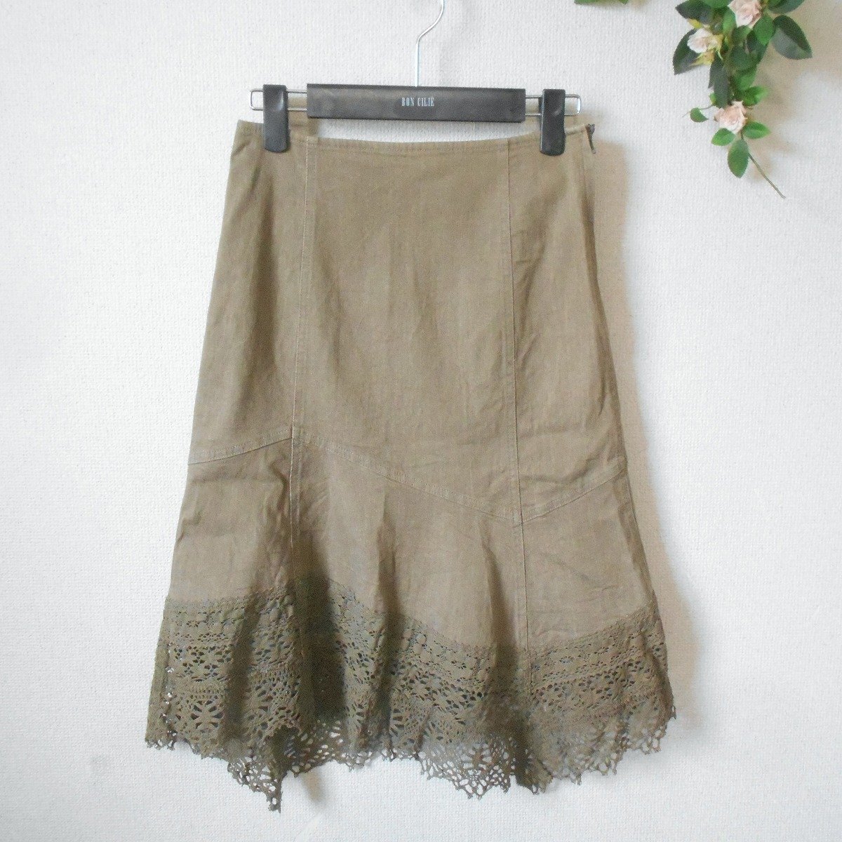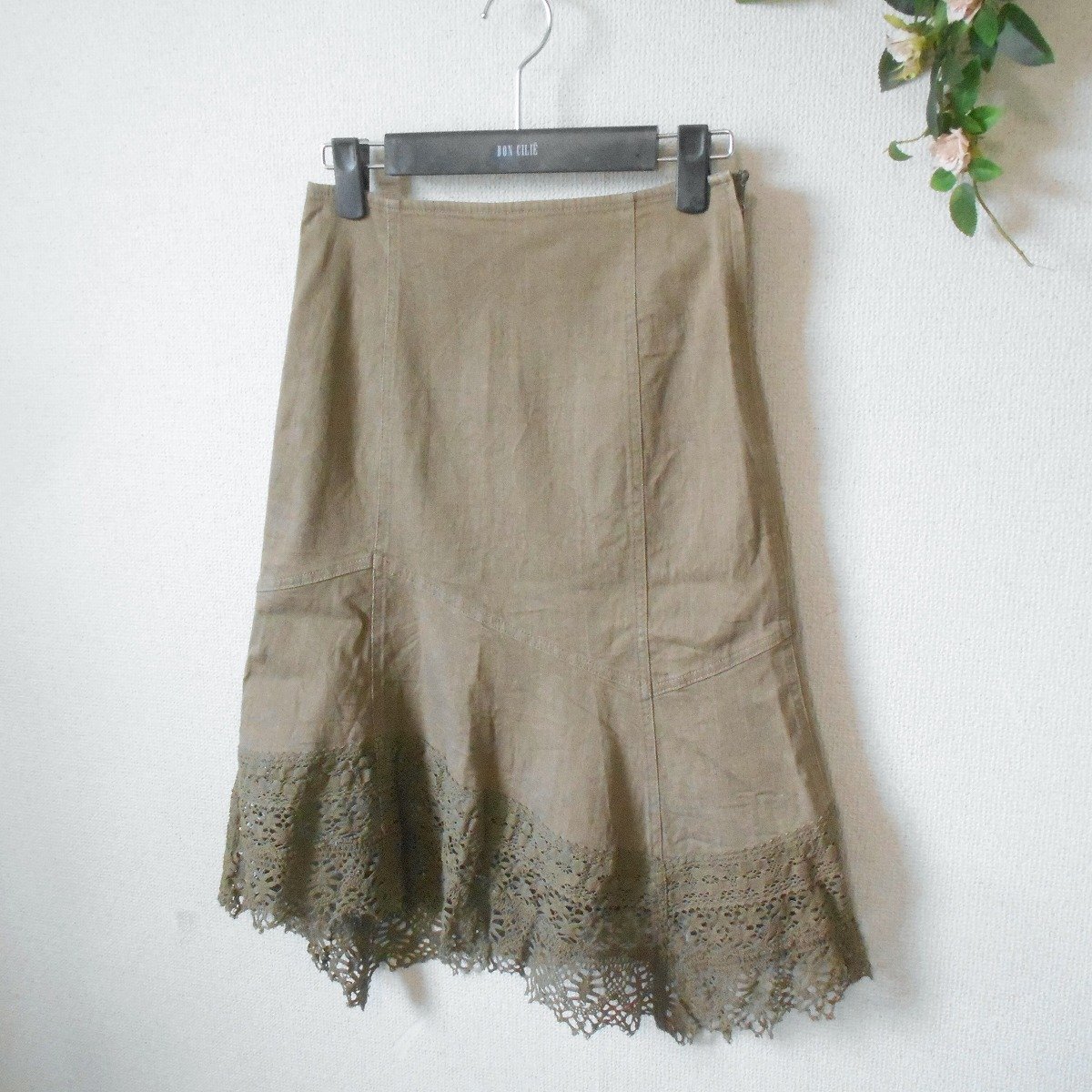 【ポイント】レストローズのスカートになります。お色はカーキ系で春夏を中心に着ていただけるお品です。裾にはレースが使用され、変形になった、とってもお洒落なデザインです。