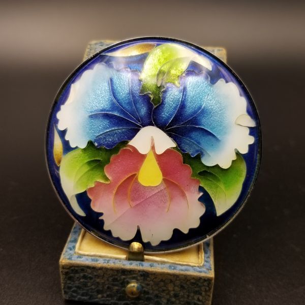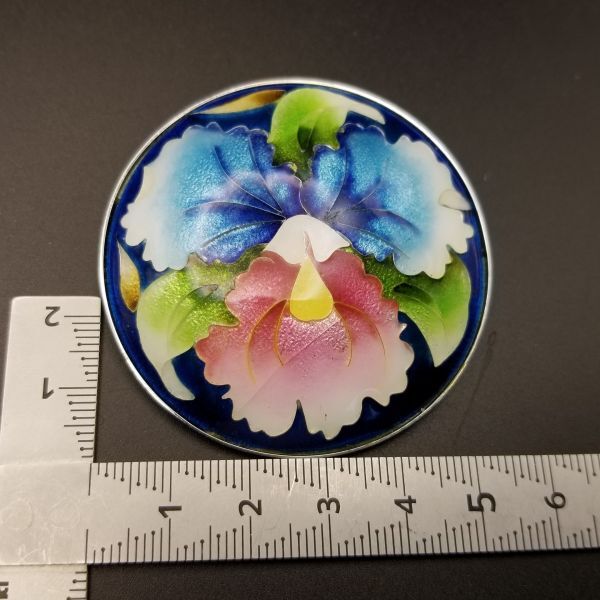 蘭の花 七宝焼き 大ぶり ヴィンテージ ブローチ ラウンド 青とピンク 印象的 存在感 ペンダント チャーム YDL③5