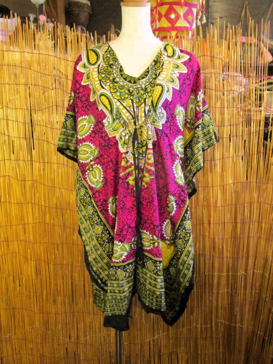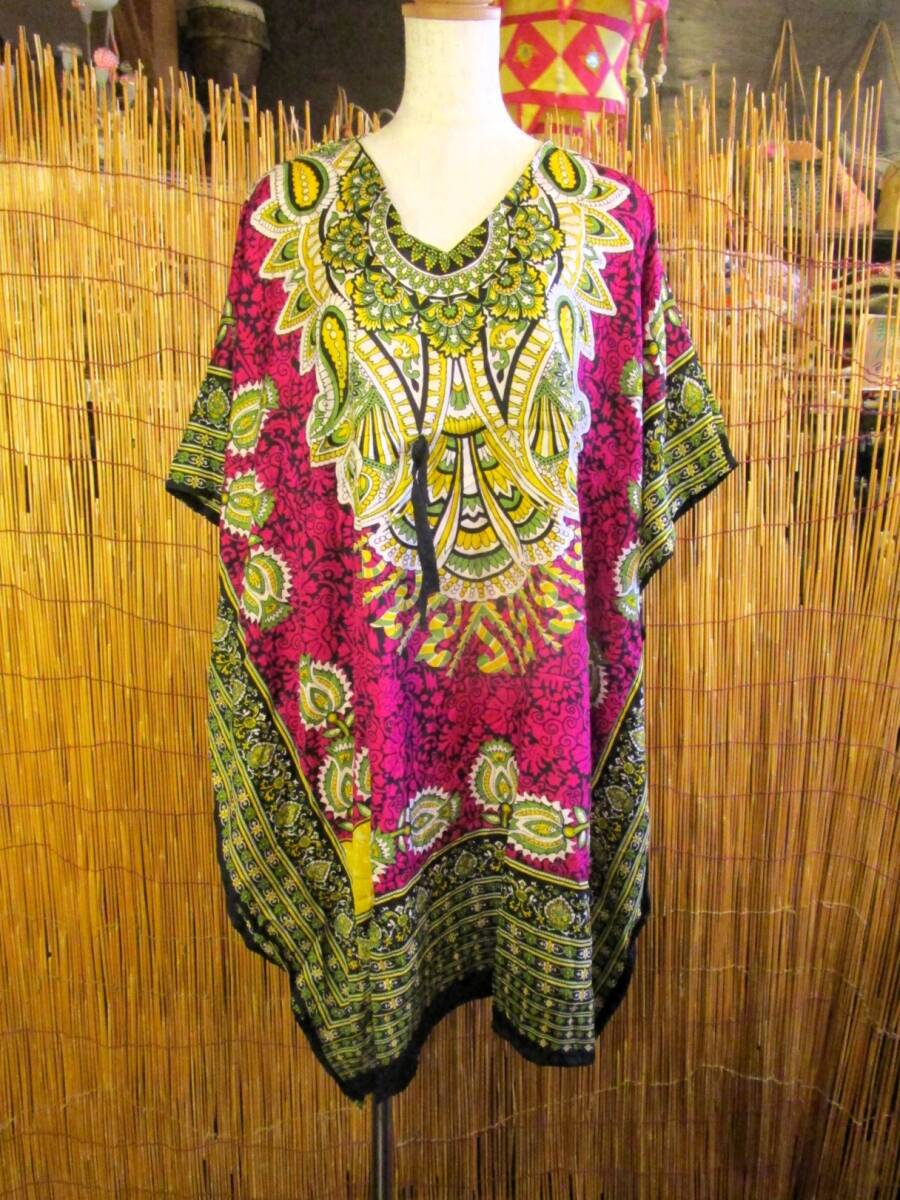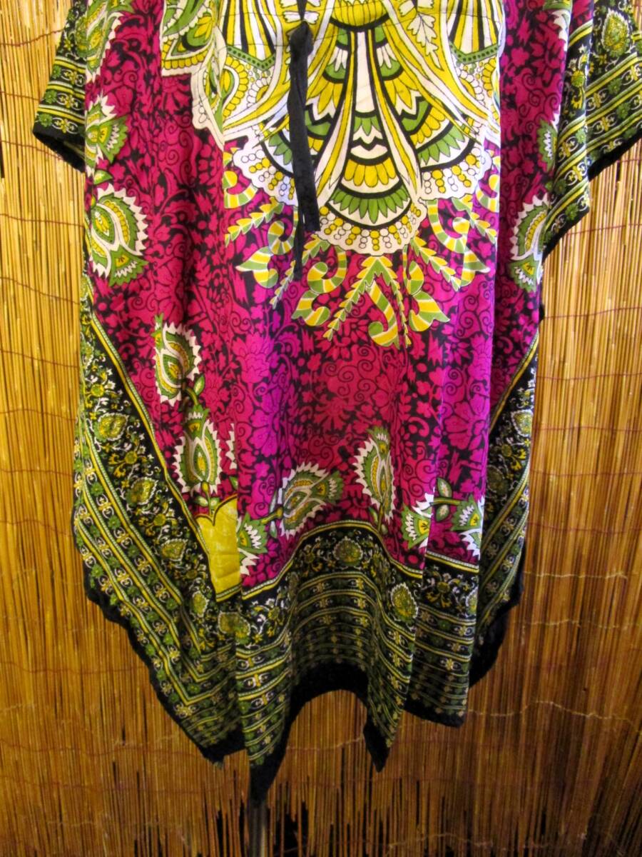 ①新品*薄手ビスコース素材*ゆったりサイズ *アジアンプリント*ガラベーヤ*ポンチョ風*ミドル丈*ワンピース*ベリーダンス