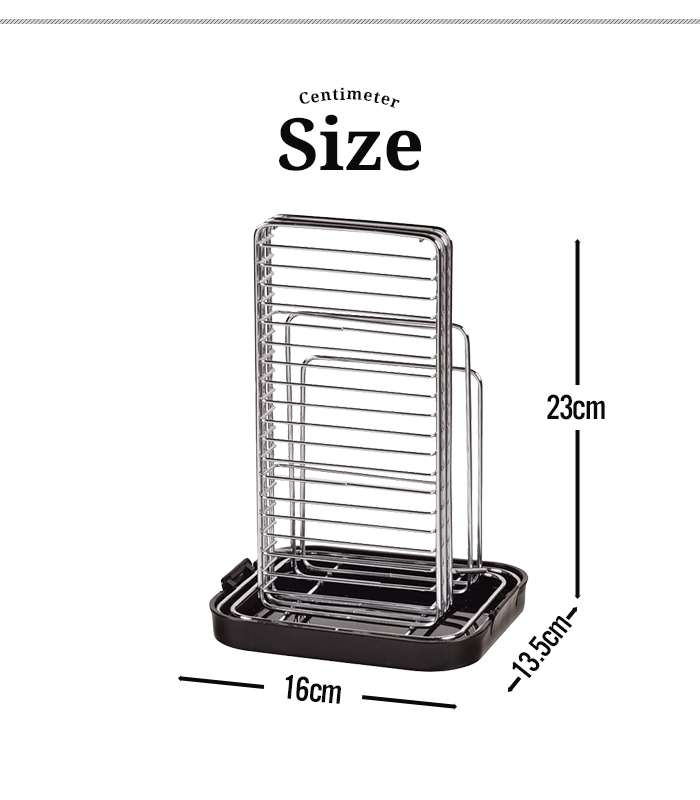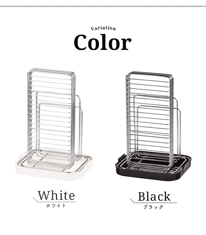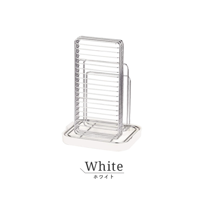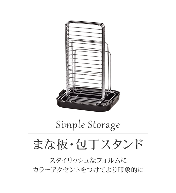 | 包丁・まな板スタンド。 柄元から先端までの長さが約200mm以内の包丁もまな板と一緒に立てて収納できます。 厚さ約25mm以下と15mm以下のまな板を立てて置けます。 防サビ加工付き。 スタイリッシュなフォルムとカラーアクセントでキッチンを明るい印象に。 |
