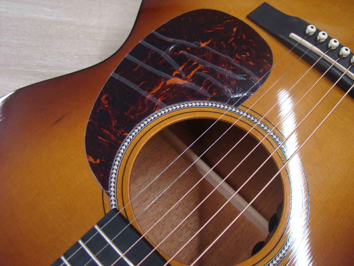 また画像にあるピックガード右上の黒く映っているものは傷ではなく、木目の一種です。