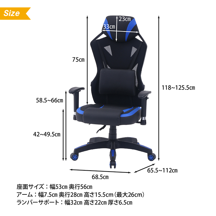 通気性バツグン! 長時間も快適なゲーミングチェア。 リラックスタイムに嬉しい無段階130度リクライニング。 アームハイ約15.5~26cmで昇降可能なアームレストは肘を最適なポジションにキープできます。 程よい硬さのクッションが体を支え、長時間の作業も快適! 広々座面サイズは約53×56cm。 幅約32×高さ22cmの上下に動く腰当てクッションは、お好みの場所で固定してお使いいただけます。 シートハイ43~50.5cmの昇降機能はレバーの簡単な操作で高さを調節できます。 背面はメッシュ、座面にはパンチングPUレザーを使用し、通気性も◎ |