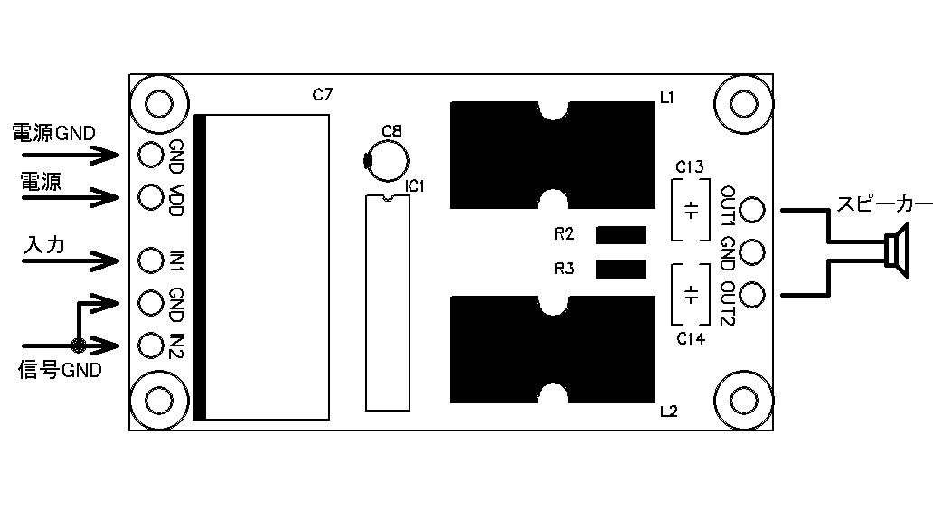 | 商品説明 | D級パワーアンプIC TPA3122D2を使った、BTLシングル / ステレオ対応基板です。 入力のカップリング・コンデンサにパナソニックのフィルムコンデンサ 「ECWU1105KCV」を採用し、 電源のバイパスコンデンサに、ニチコンのMUSE・KZ 25V 1000uFを使用。 また、フィルターのコイルには低直流抵抗の大型トロイダル・コイルを使用、 高音質に寄与しています。 ■回路図です。 (画像をクリックすると大きな図面になります) ![]() ■ステレオ接続の配線 (画像をクリックすると大きな図面になります) ![]() この基板1枚でステレオ・アンプになりますが 音質的に BTLモノ接続に比べ劣ります。 また、直流カット用電解コンデンサーや、ミュート回路などが別途必要です。 ■BTLモノラル接続の配線(1チャンネル) (画像をクリックすると大きな図面になります) ![]() モノラル接続では、IN2入力をGNDとショートしてください。 入力はIN1とGNDのみになります。 モノラルですので、ステレオでは2枚必要ですが、出力に大容量電解コンデンサーも、ミュート回路も不要です。※電源オフ時に「ポッ」と言う 小さな音が出る事があります。 音質的には、BTLモノラル接続の方が優れていますので、モノラル接続をオススメします。 電源電圧はDC10 から 20Vの単電源が使用でき、スイッチング電源でもトランス式電源でもOKです。 ノートパソコンに使われる、19Vのスイッチング電源も結構 パフォーマンスが良いです。 ※TPA3122D2単体の、電圧定格は10 から 30Vですが、1000uFの電解コンデンサーの耐圧が25Vですので、もし20V以上でご使用される場合は、このコンデンサーを変更してください。 ※部品は予告なく変更する場合があります。ご了承下さい。 詳しい解説サイトを作りましたので、こちらのサイトをご覧ください。 クリックポスト(185円)で発送いたします。 ![]() |