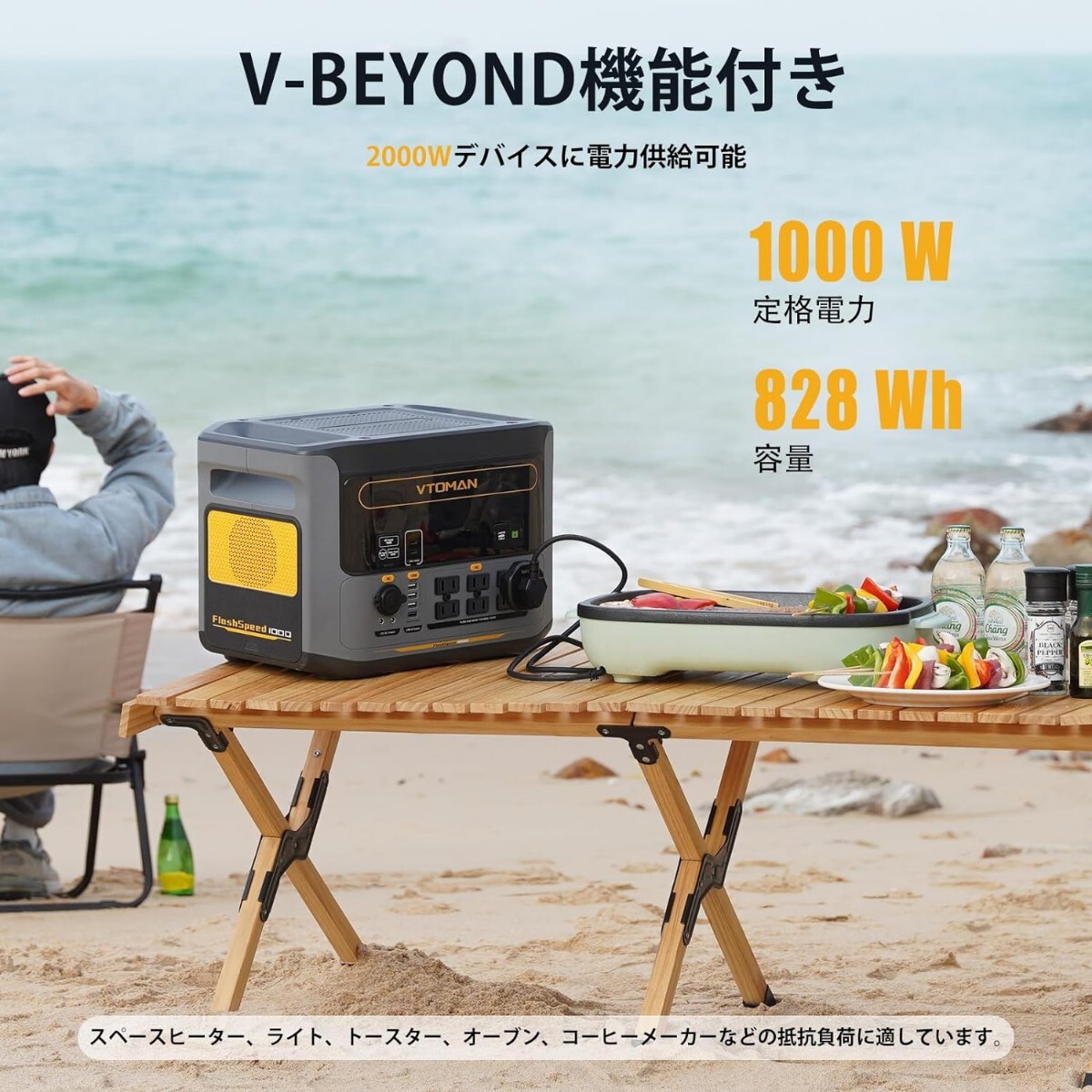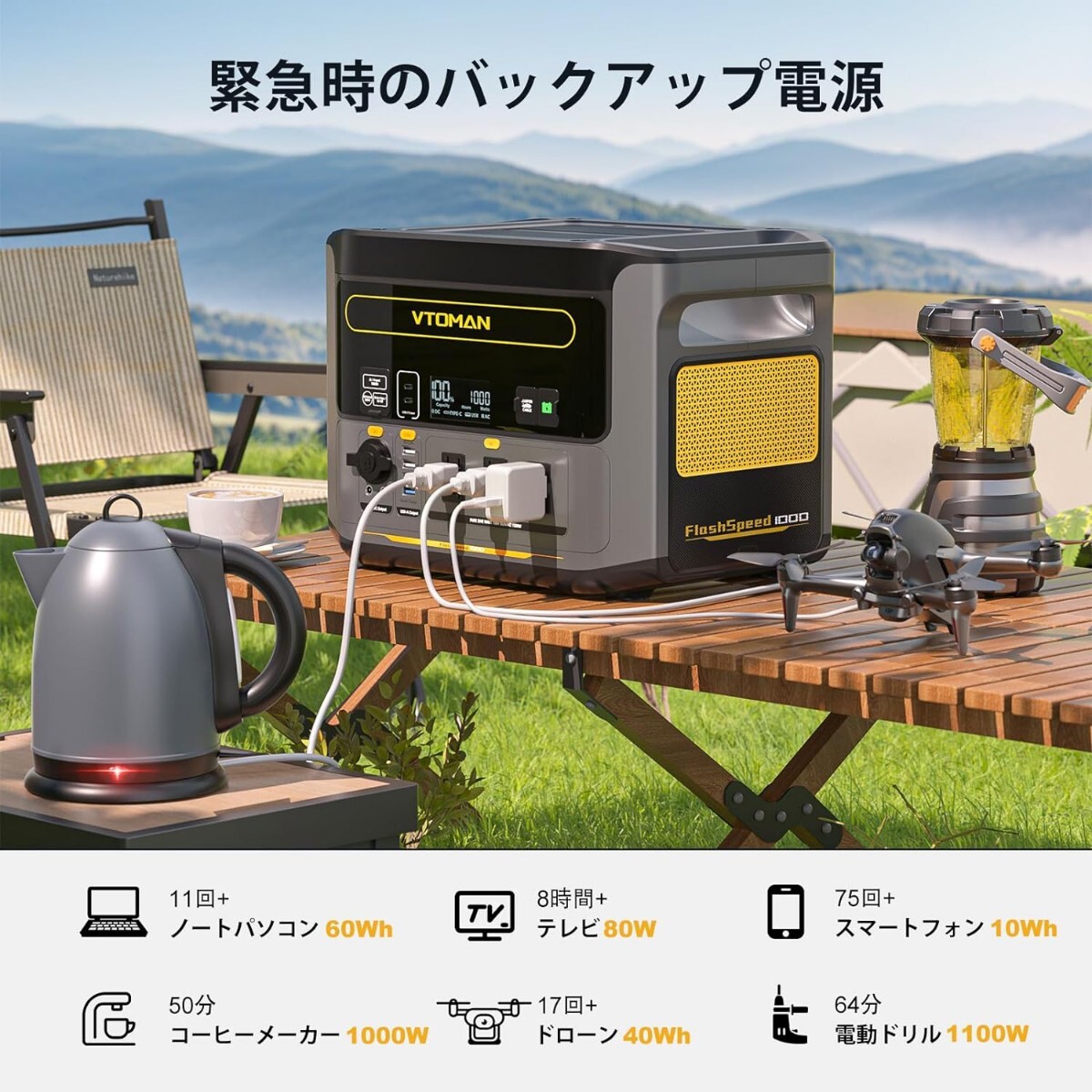 【99%以上の家電を充電】 最大出力1000W(瞬間最大2000W)に対応したVTOMAN FlashSpeed 1000は、キャンプ用機器やDIY作業用の高出力機器にも問題なく対応します。