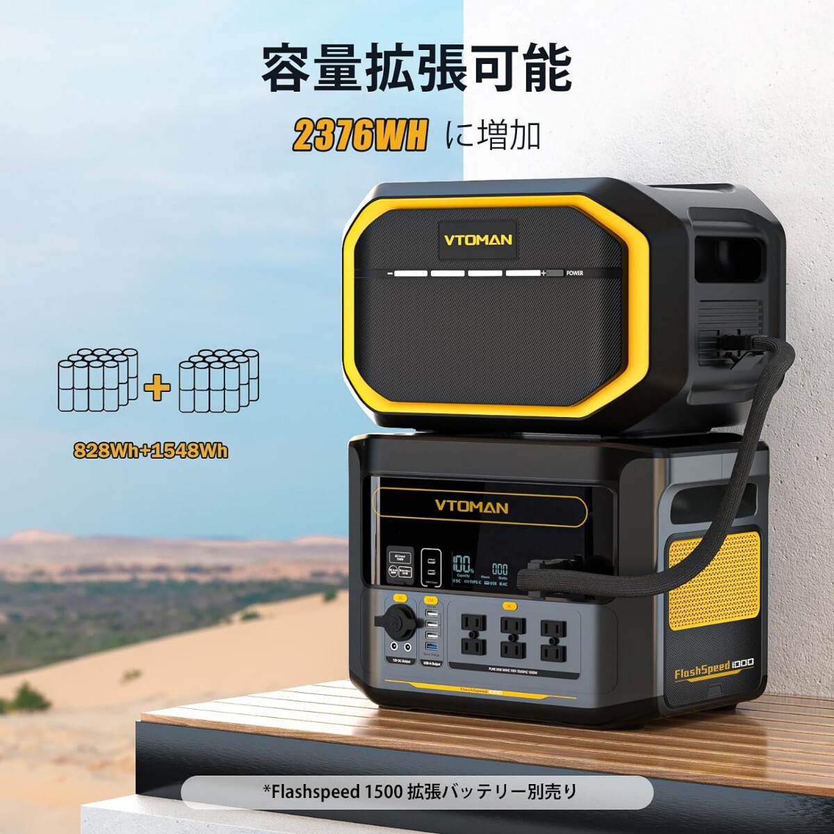 【拡張可能な容量】 VTOMAN FlashSpeed 1000ポータブル電源は828Wh大容量です、VTOMAN Flashpeed 専用拡張バッテリーの容量で最大2376Whに拡張可能です。アウトドアや停電時の緊急対策に最適です。