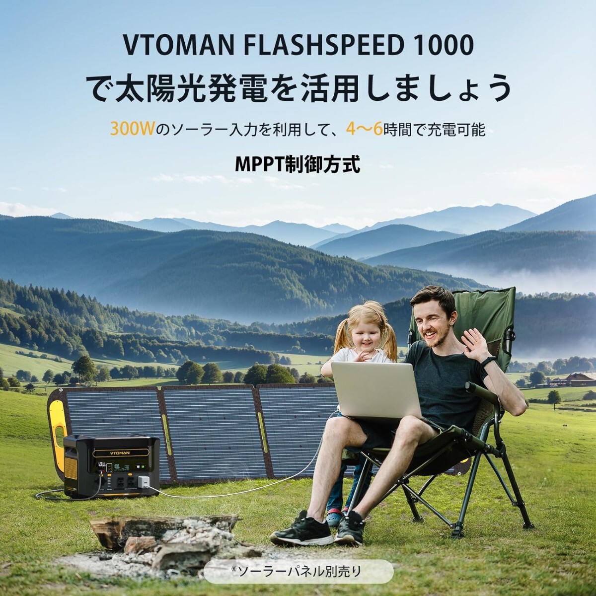 【ソーラー充電に対応】 環境に優しい再生可能エネルギーを使用し、最大ソーラーパネル入力300W、最速4-6時間で充電が可能です。キャンプ先などの屋外環境でも電力を確保できます。